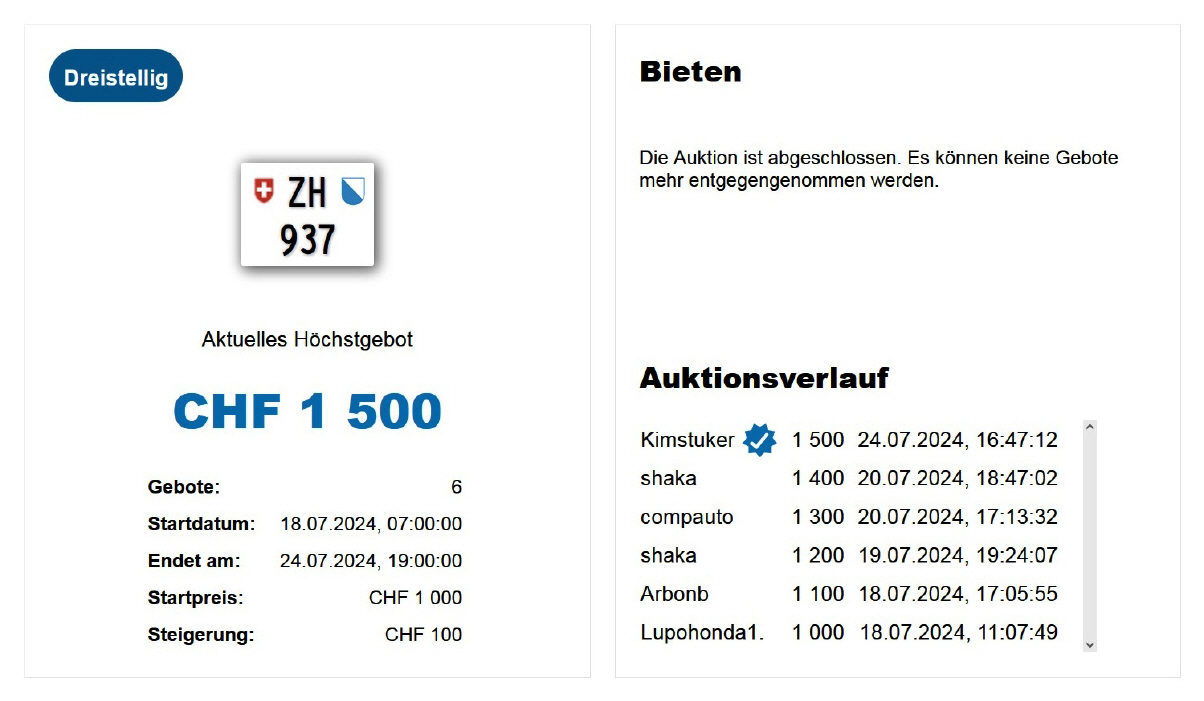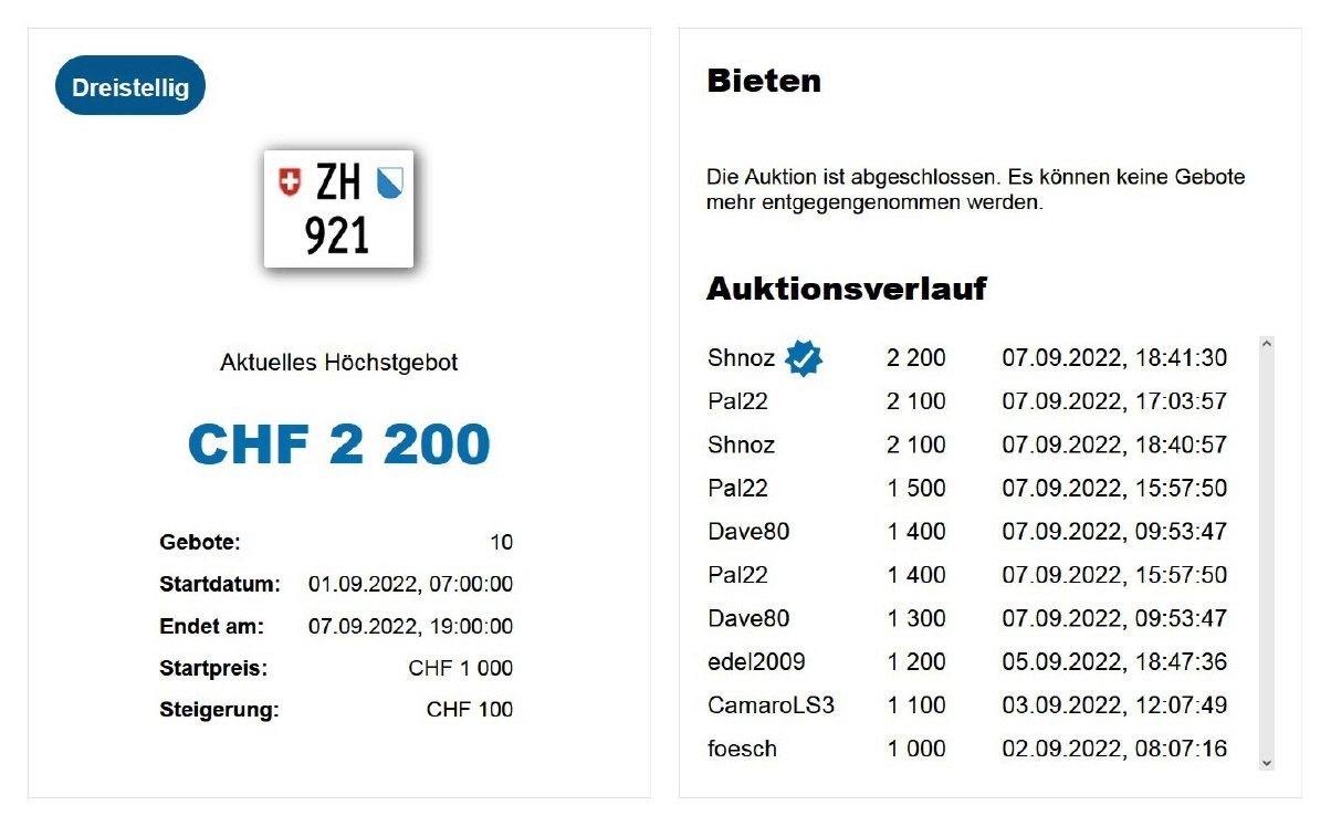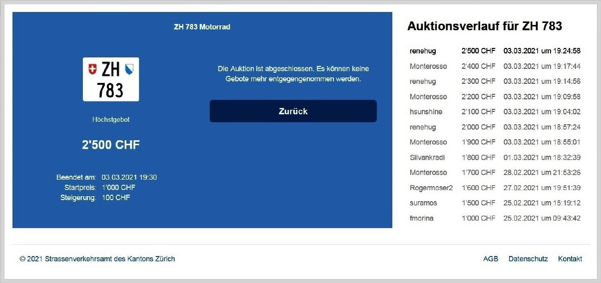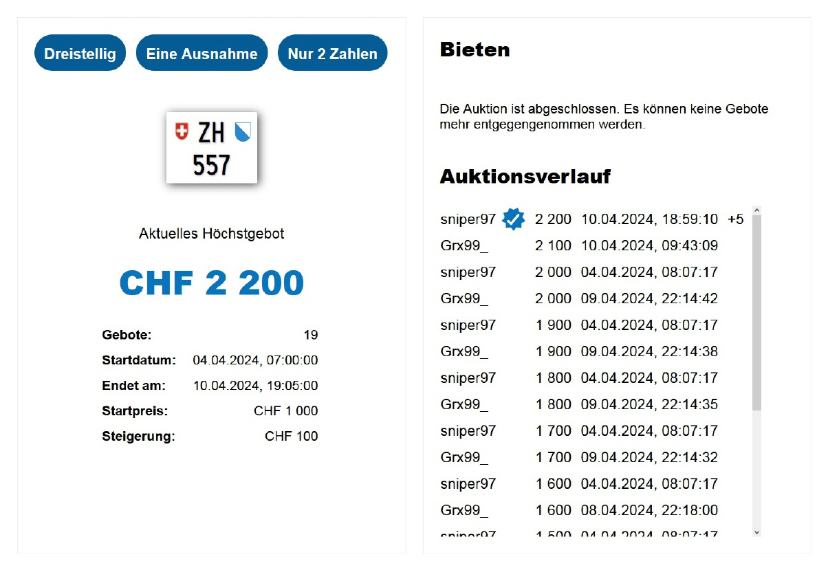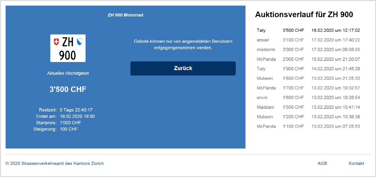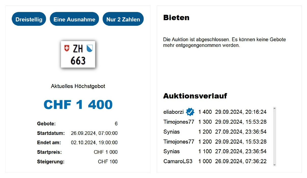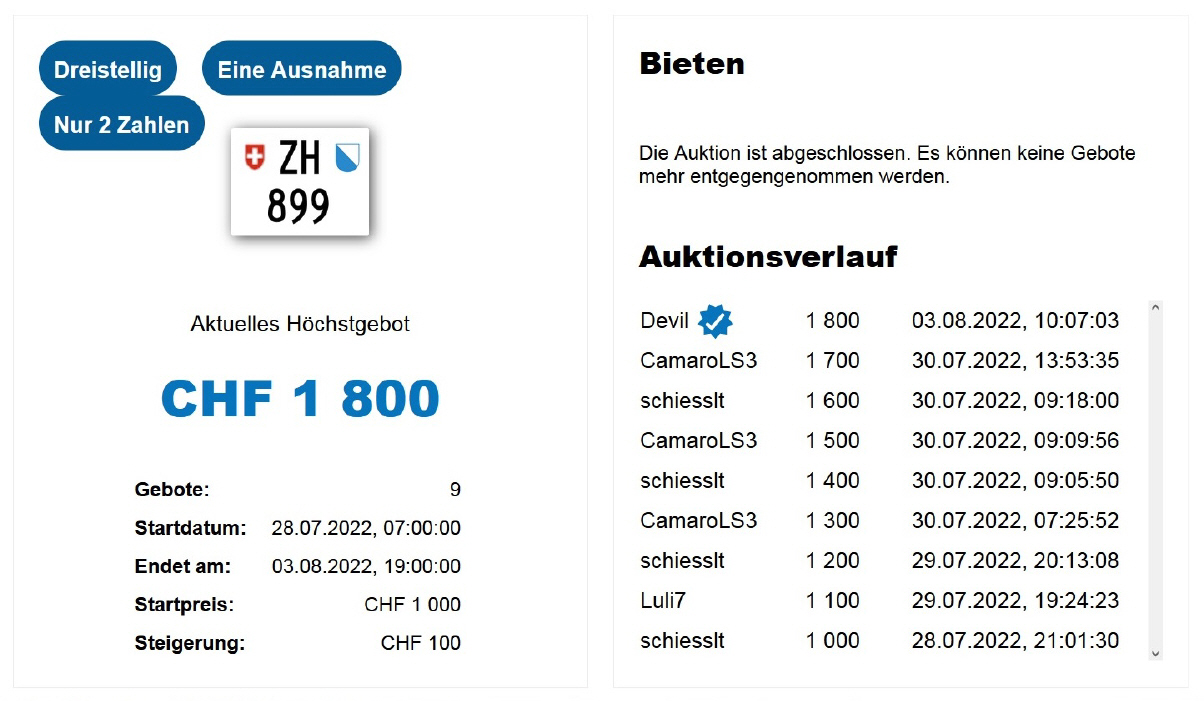 Am 25.11.2020 wurde im Kanton Zürich das 3-stellige TÖFF-Nummernschild ausgegeben - in der Auktion ging es für Fr. 4000.- weg: Auch hier boten sich zwei Bieter hoch! Verfolge den Verlauf vom «ZH 701
