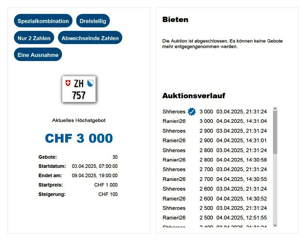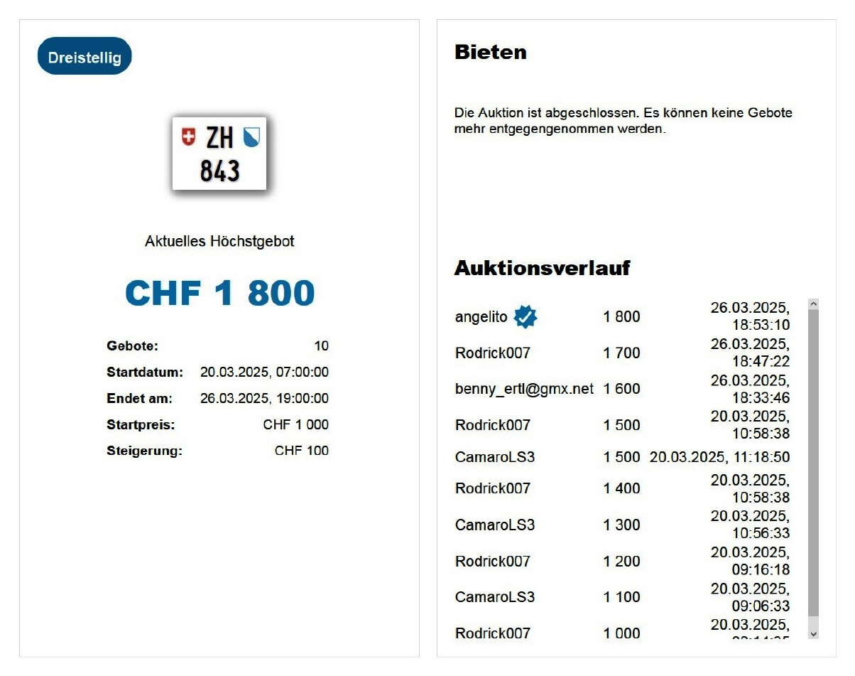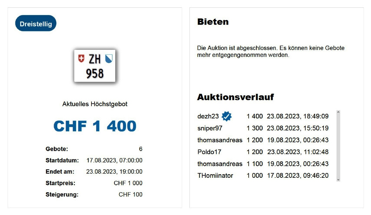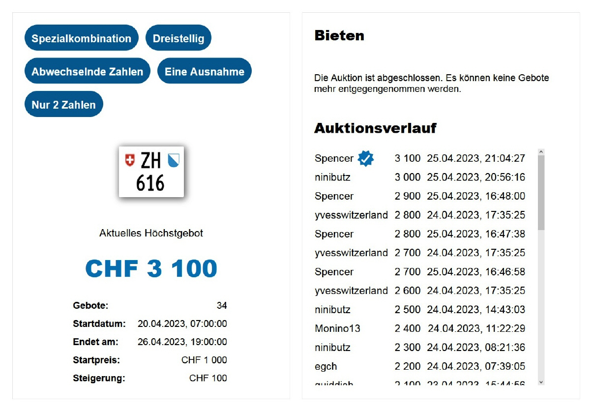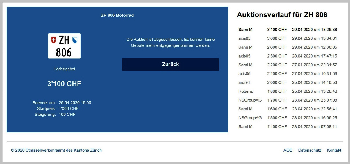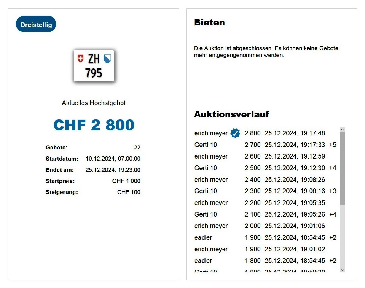 Am 25.11.2020 wurde im Kanton Zürich das 3-stellige TÖFF-Nummernschild ausgegeben - in der Auktion ging es für Fr. 4000.- weg: Auch hier boten sich zwei Bieter hoch! Verfolge den Verlauf vom «ZH 701