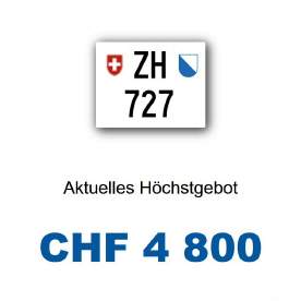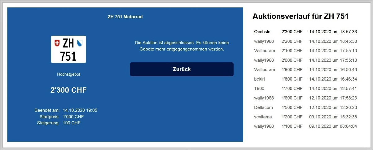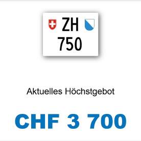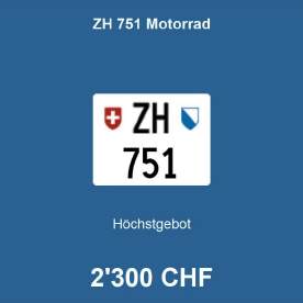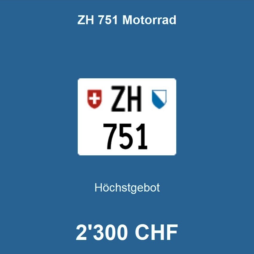 Am 14.10.2020 wurde im Kanton Zürich das 3-stellige TÖFF-Nummernschild ausgegeben - in der Auktion ging es für nur Fr. 2300.- weg: Verfolge den Verlauf vom «ZH 751