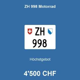Am 11.11.2020 wurde im Kanton Zürich das 3-stellige TÖFF-Nummernschild ausgegeben - in der Auktion ging es für Fr. 4500.- weg: Zwei Bieter trieben es noch hoch! Verfolge den Verlauf vom «ZH 998