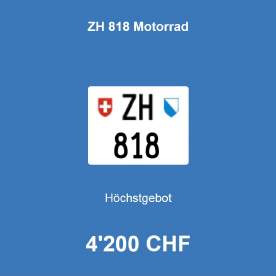 Am 13.01.2021 wurde im Kanton Zürich das 3-stellige TÖFF-Nummernschild ausgegeben - in der Auktion ging es für gute Fr. 4200.- weg: Verfolge den Verlauf vom «ZH 818