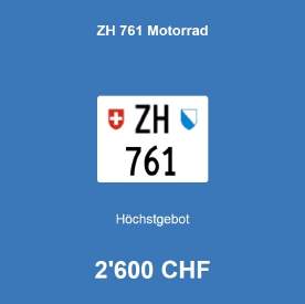 Am 28.04.2021 wurde im Kanton Zürich das 3-stellige TÖFF-Nummernschild ausgegeben - in der Auktion ging es für unglaublich tiefe Fr. 2600.- weg, nochmals ein Schnäppchenpreis! Verfolge den Verlauf vom «ZH 761