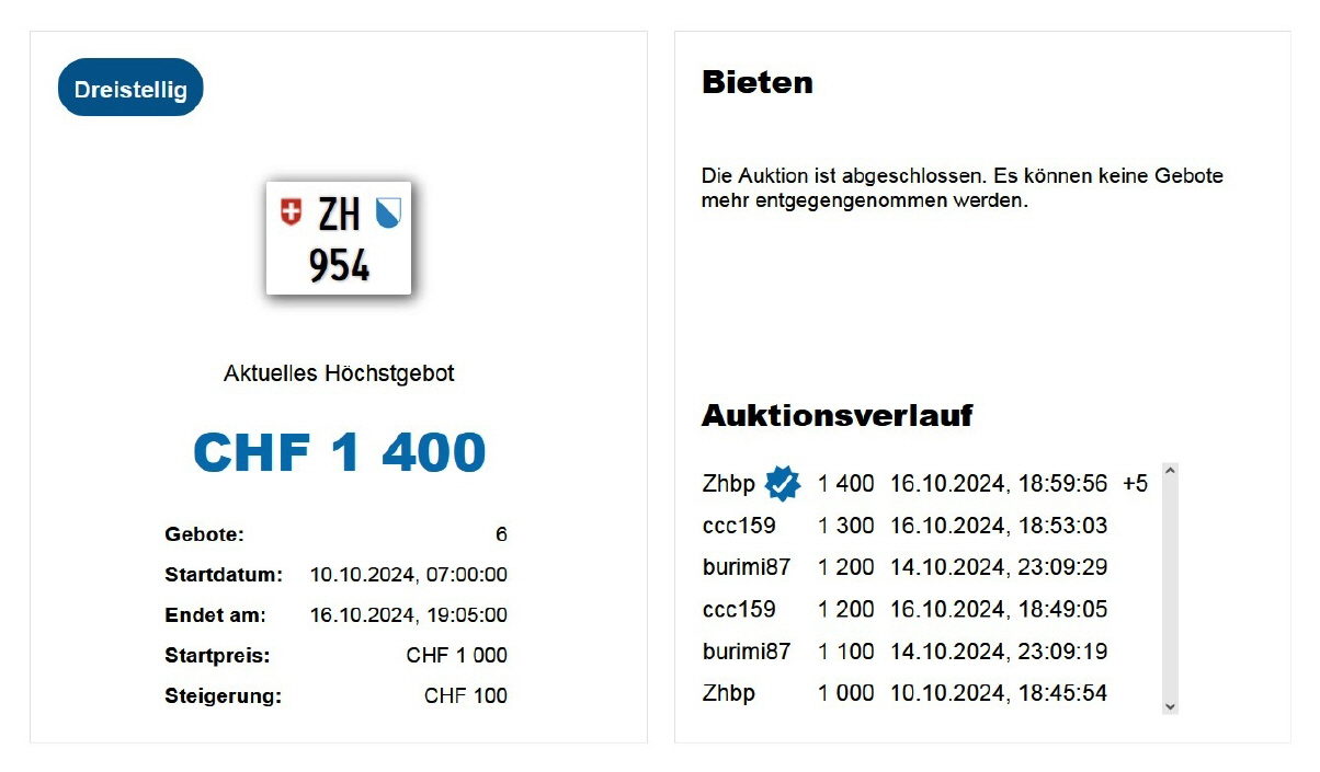Am 16.10.2024 wird im Kanton Zürich das nächste 3-stellige TÖFF-Nummernschild ausgegeben - in der Auktion ging es zum sagenhaft niedrigen Preis von nur Fr. 1400.- weg! Verfolge den Verlauf vom «ZH 954