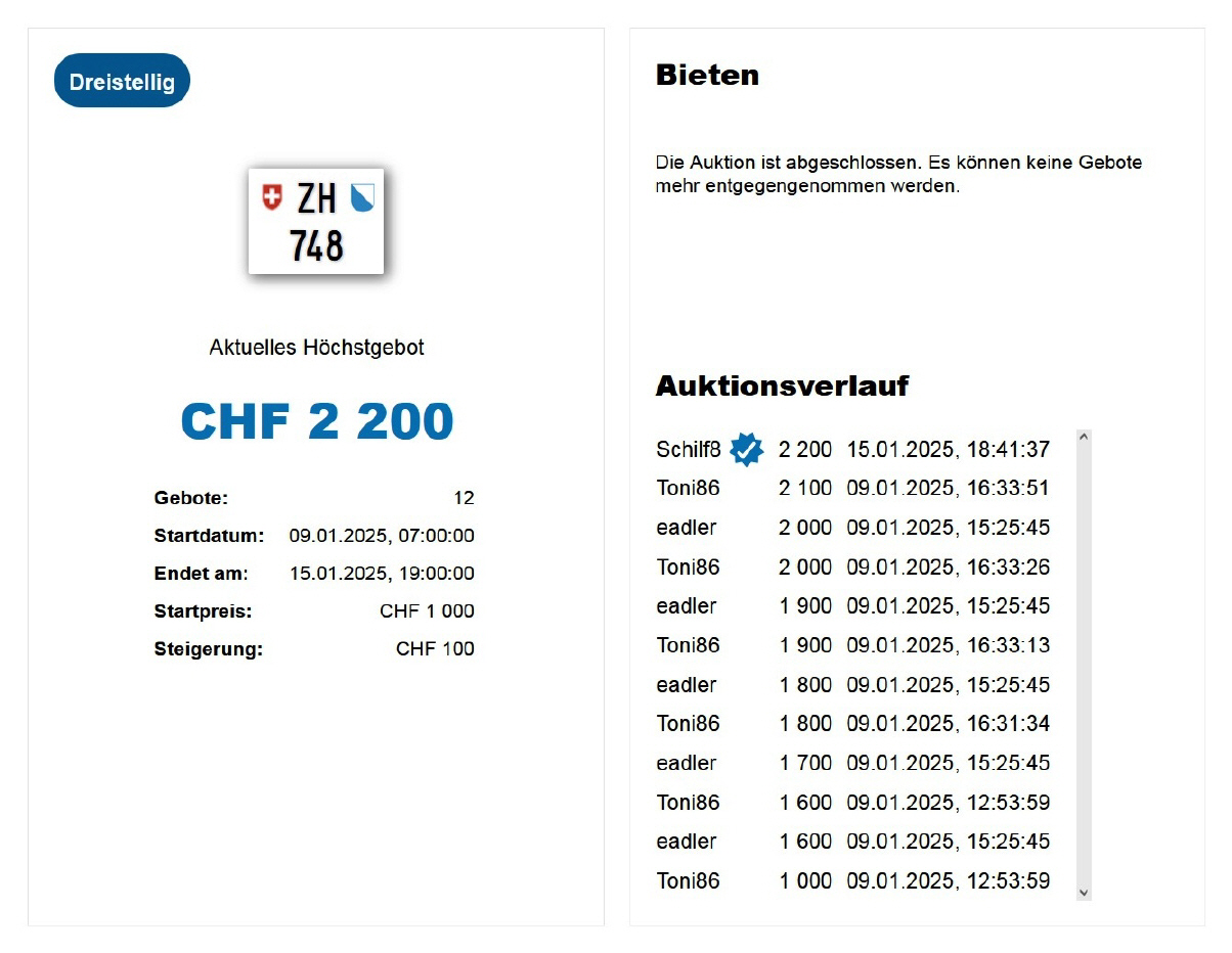 Am 15.01.2025 wurde im Kanton Zürich das nächste 3-stellige TÖFF-Nummernschild ausgegeben - in der Auktion ging es zum durchschnittlichen Preis von Fr. 2200.- weg! Verfolge den Verlauf vom «ZH 748