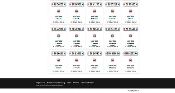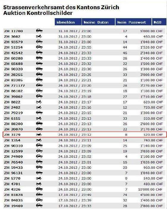 Es ist allein schon interessant, dies zu beobachten. Wenn man sich beim Strassenverkehrsamt einschreibt, bekommt man (wie ich) jeden Montag ein E-Mail zum Einloggen! Passieren tut es dann jeweils am Mittwochabend um 23.00 Uhr - aufgepasst, mitbieten ist gefährlich, Du könntest in den Rausch kommen. Also nur solange mitbieten, als es nicht (oder nur ein bisschen ...) weh tut!