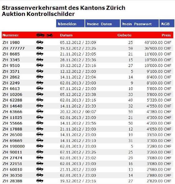 Was die Leute bereit sind, zu bezahlen für ganz besondere Nummernschild kannst Du auf der untenstehenden Liste anschauen: Während andere zufrieden sind, für 25'000 Franken sich ein neues Auto kaufen zu können, gibt es welche, die schon nur für das Nummernschild bereiot sind, 40'100 Franken zu bezahlen! Ob der glückliche Besitzer wenigstens auch das entsprechende Auto hat, um wohl «seinen Jahrgang» ZH 1980 dranzuhängen?