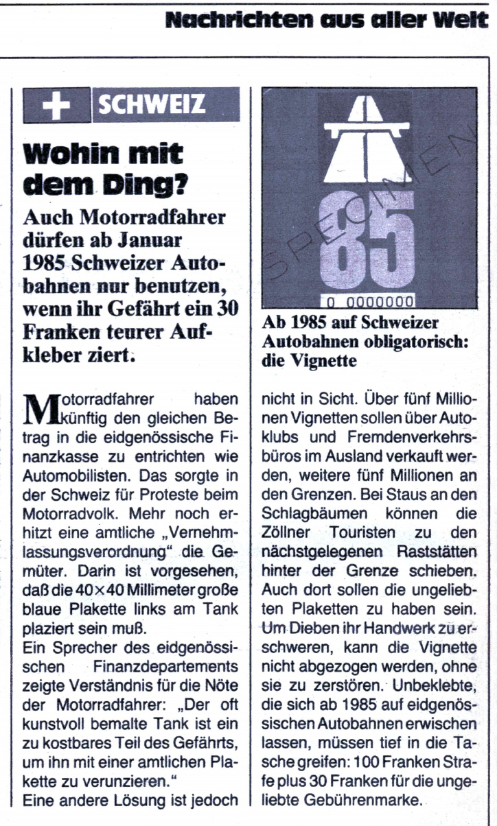 Die Vignette war ein Ärgernis schon bei deren Einführung im Jahr 1985. Erstens wurde bemängelt, dass ein Zweiradfahrer genau gleich viel zahlen muss wie ein Autofahrer, also (bei deren Einführung) auch deren 30 Franken. Beim Auto wurde genau definiert, an welchen Stellen sie aufgeklebt werden durfte, während dies bei den Motorrädern nicht so klar war. Beim Thema Töff hatten sie in Bern nicht wirklich «pro-Töff» gehandelt, wie ein Artikel