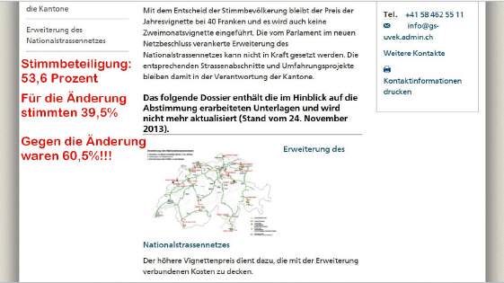 Dem Initiativ-Kommitee um den rührigen Solothurner Nationalrat Walter Wobmann, seines Zeichen oberster Töff-Fahrer der Schweiz (Präsident der FMS, welche die Rennhoheit der FIM in der Schweiz vertritt) war es zu verdanken, dass wir darüber abstimmen konnten. Entgegen aller Parteien, die für eine Erhöhung dieser Abgabe waren, lehnte aber das Schweizervolk bei einer Stimmbeteiligung von 53,6% die Änderung mit ab: Die Ja-Stimmen betrugen nur 39,5%, das entspricht 3/5 der Stimmen waren gegen die Erhöhung der Vignettengebühr.