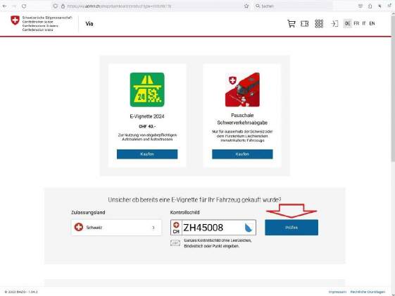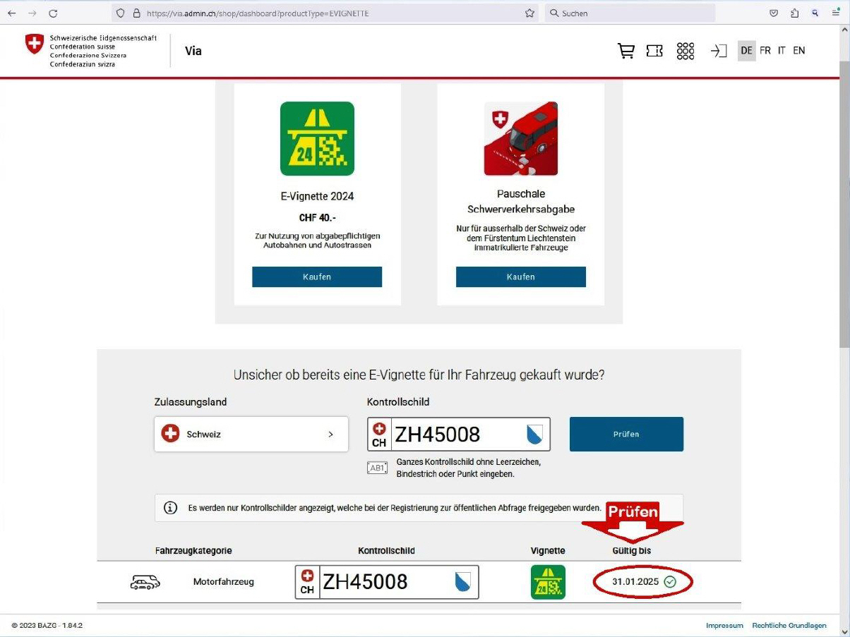 Mit der Eingabe des Nummernschildes sieht man ob die Vignette dafür gültig