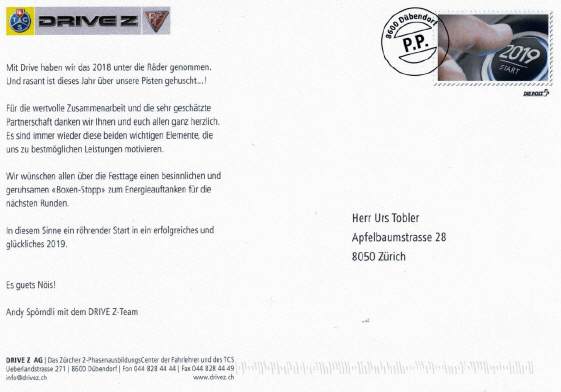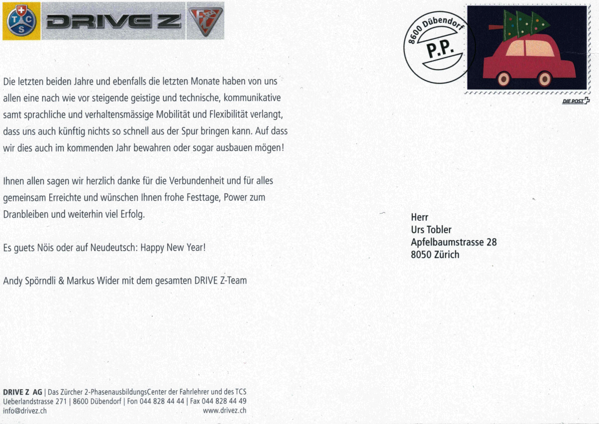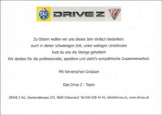 Alle Jahre wieder trifft vom «DriveZ»-Team ein süsser Dank in Form eines Lindt-Schokohasens ein, vielen vielen Dank! Meine Empfehlung an alle, die einen Zweiphasen-Kurs absolvieren müssen: Dort bist Du gut aufgehoben!