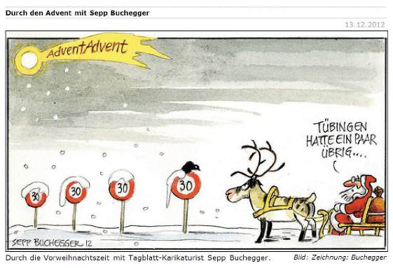 Meine Freundin Sigrid kommt aus dem Schwäbischen: Zu Besuch bei ihrer «Mamme» entdeckten wir diese tolle Karrikatur von Sepp Buchegger, der während der Adventszeit diese tollen Karraikaturen zeichnet. Wenn Du Dir alle zu Gemüte führen möchtest, dann klicke auf das Bild unten! (aus Schwäbisches Tagblatt «tagblatt.de»)