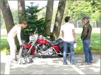 Roger, mein Fahrschüler, besitzt seit mehr als 12 Jahren einen Töff, seit 2004 eine grosse Harley im amerikanischen Look. Er lebte viele Jahre in Amerika, kam vor etwa einem Jahr zurück und muss hier noch die Töff-Prüfung machen. Er hat an und für sich seinen Töff soweit im Griff, aber (noch) nicht geht alles Prüfungs-konform... |