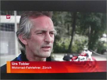 Nach diversen Fahrten um entsprechende Bilder zu bekommen, landeten wir schliesslich in der Dreiwiesen, wo ich mein Abschluss-Statement geben musste. Roger enthielt sich der Stimme, er überliess es dem Fachmann. Sowohl die Fahraufnehmen wie auch die Harley im Hintergrund während des Gesprächs dürfte den Harley-Importeur freuen!!! |
