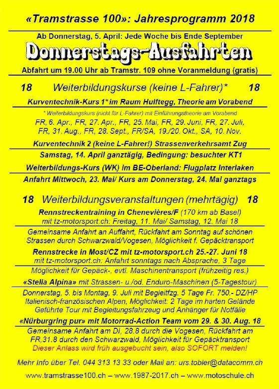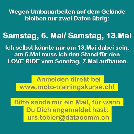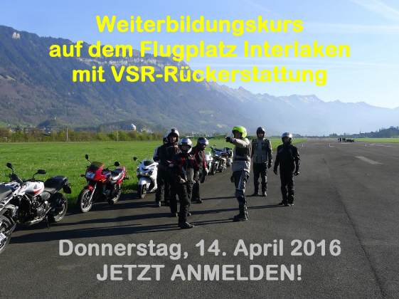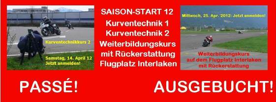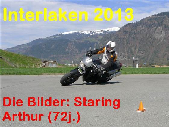 Der beliebte Kurs, diesmal leider ohne unserem beliebten Kurventechnik-Instruktor Roland Schneider findet am Donnerstag, 21.Mai 2015 statt: Wir fahren jeweils gemeinsam hin am Mittwochabend und übernachten nur wenige Minuten vom Kursgelände entfernt! Ich führe die Gruppe ab Parkplatz Waldegg um 17.00 Uhr, Arthur startet um 14 Uhr an der Tramstrasse 100 und um 14.30 Uhr in der Waldegg und bringt diejenigen nach Bönigen, die lieber etwas gemütlicher fahren. |