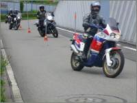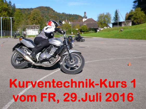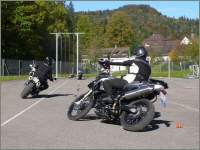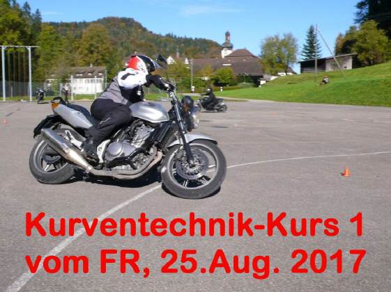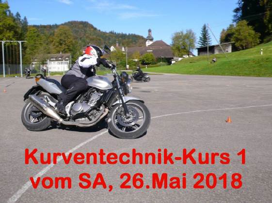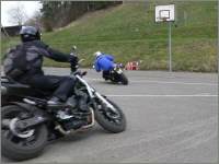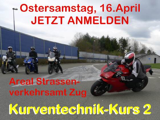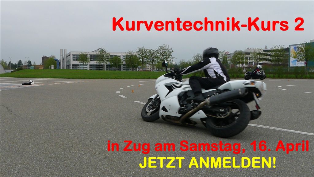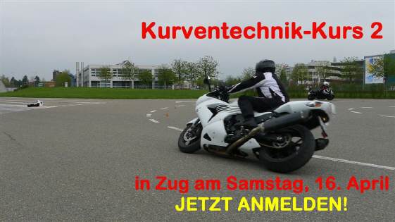 Im Kurventechnik-Kurs 2 , welcher im Strassenverkehrsamt Zug in Steinhausen stattfindet, wird Theorie und Praxis verknüpft. Das Strassenverkehrsamt in Zug muss ich jeweils extra mieten! Wir treffen uns frühmorgens um 8 Uhr im Rest. Hörnli in Knonau. Nach allerlei Stabilisierungs-, Blickführungs- und Bremsübungen am Vormittag, widmen wir uns im Nachmittagsprogramm dem «verschärftem» Schräglagentraining, schnellen Slalom und Ausweich-Übungen. Diese finden auf dem Gelände des Strassenverkehrsamtes in Zug statt. |