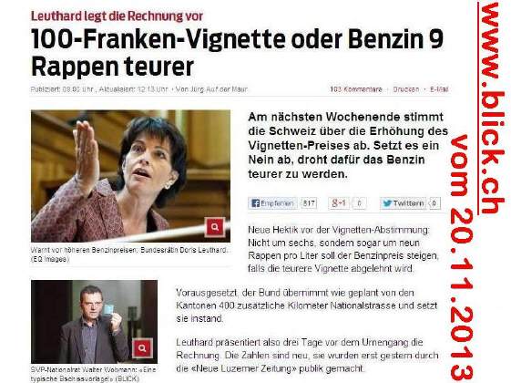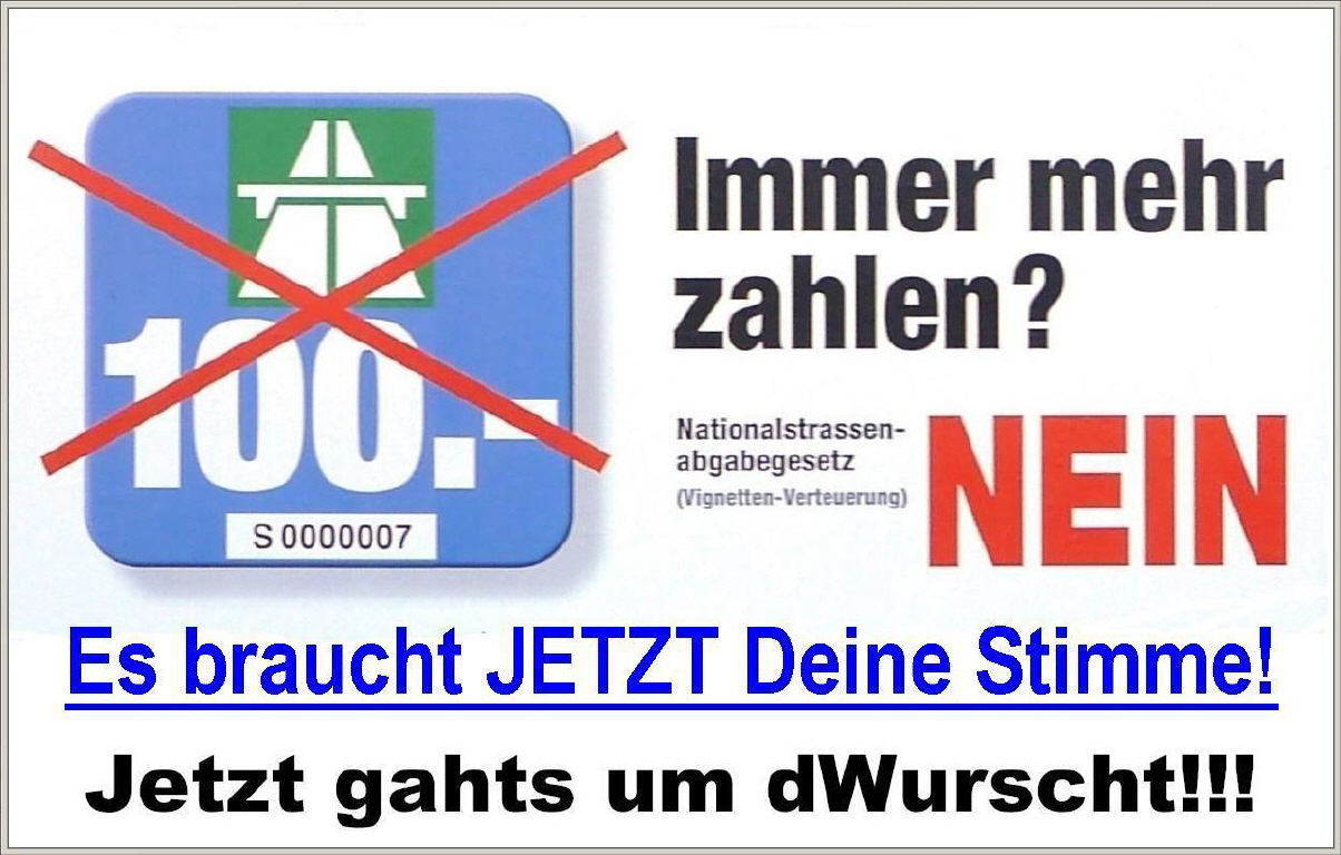 Am kommenden Sonntag findet die Abstimmung zur Verteuerung der Autobahn-Vignette statt. Das Volk wird einmal mehr dazu befragt und mit scheinheiligen Argumenten wird von der Tatsache abgelenkt, dass die 150%-Verteuerung eine Strafsteuer für alle Fahrzeug-BESITZER (für JEDES Fahrzeug braucht es EINE Vignette) ist - OHNE GEGENLEISTUNG: Mit diesem Geld wird es keinen Stau weniger geben, keine Strasse kann schneller gebaut werden (mit Ausnahme der explizit erwähnten 3 Projekte) - denn, was fehlt, ist das Konzept und der politische Wille! Es gibt nur ein Mittel, etwas zu ändern an der Pflästerli-Politik des Bundes: Vorlage ZURÜCK AN DEN ABSENDER! Das Parlament wird dann vom Volk gezwungen, eine mehrheitsfähige Vorlage vors Volk zu bringen, denn ohne Referendums-Komitee hätte das Parlament alleine darüber entschieden ...