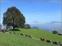 Von Knonau fuhren wir Richtung Innerschweiz: Über viele kleine Strässchen fuhren wir ins Entlebuech und über Malters nach Schwarzenberg, wo es an einem wunderbaren Aussichtspunkt etwa eine Stunde nach dem Start eine Apéro-Pause gab. Maja Vogel, die jüngere Schwester von Urs, erwarte die Gesellschaft und verwöhnte uns mit einer herrlichen Auswahl verschiedener Köstlichkeiten. |