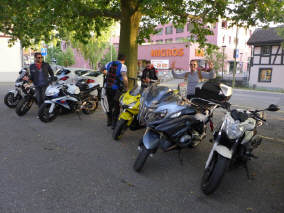 Nachdem ich am 29.Juni passen musste, konnte ich es am 6.Juli einrichten. Allerdings hatte ich mich komplett verhauen in dem Plan, wie schnell ich am Treffpunkt in Schlieren sein würde. Als ich von Uitikon her eintraf, gab es einen Stau, der sich keinen Meter bewegte. Für ein Mal warf ich alle guten Vorsätze, wie sich ein Töfffahrer zu verhalten hat, über den Haufen und schaute, wie es irgendwie vorwärts ging, mit einem Töff vom Kaliber einer GoldWing, plus zusätzlich meinem Einradanhänger hinten dran, ein recht heikles Unterfangen. Gegenüber den Autofahrern, die sich eine Viertelstunde und mehr gedulden mussten, verlor ich vielleicht nur 5 Minuten - in Anbetracht aber, dass ich nicht wirklich wusste, wo der Sammelplatz war, trotzdem eine Katastrophe. Da mich meine 350er-Yamaha im Stich gelassen hatte und ich auf die GoldWing umsatteln musste, war ich eh fast eine halbe Stunde verspätet. Ich hatte mich mit Yannis verabredet, mit ihm ab Altstätten zu fahren, was aber eben ins Wasser fiel. So irrte ich im Industriegebiet südlich der Bahnlinie herum, drehte offenbar eine Runde, da wo die anderen warteten, aber ohne sie zu sehen. Bei meiner Weiterfahrt - eigentlich hatte ich das Vorhaben bereits abgeschrieben - läutete das Handy und Andrea war dran: Er lotste mich zurück und ohne Startbild machten wir uns mindestens 20 Minuten verspätet zu sechst auf den Weg. |