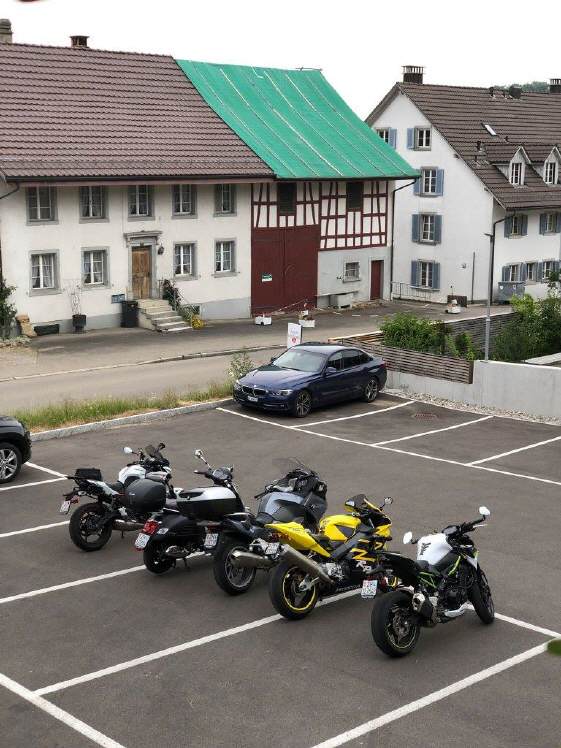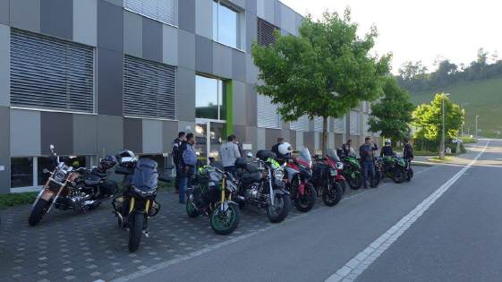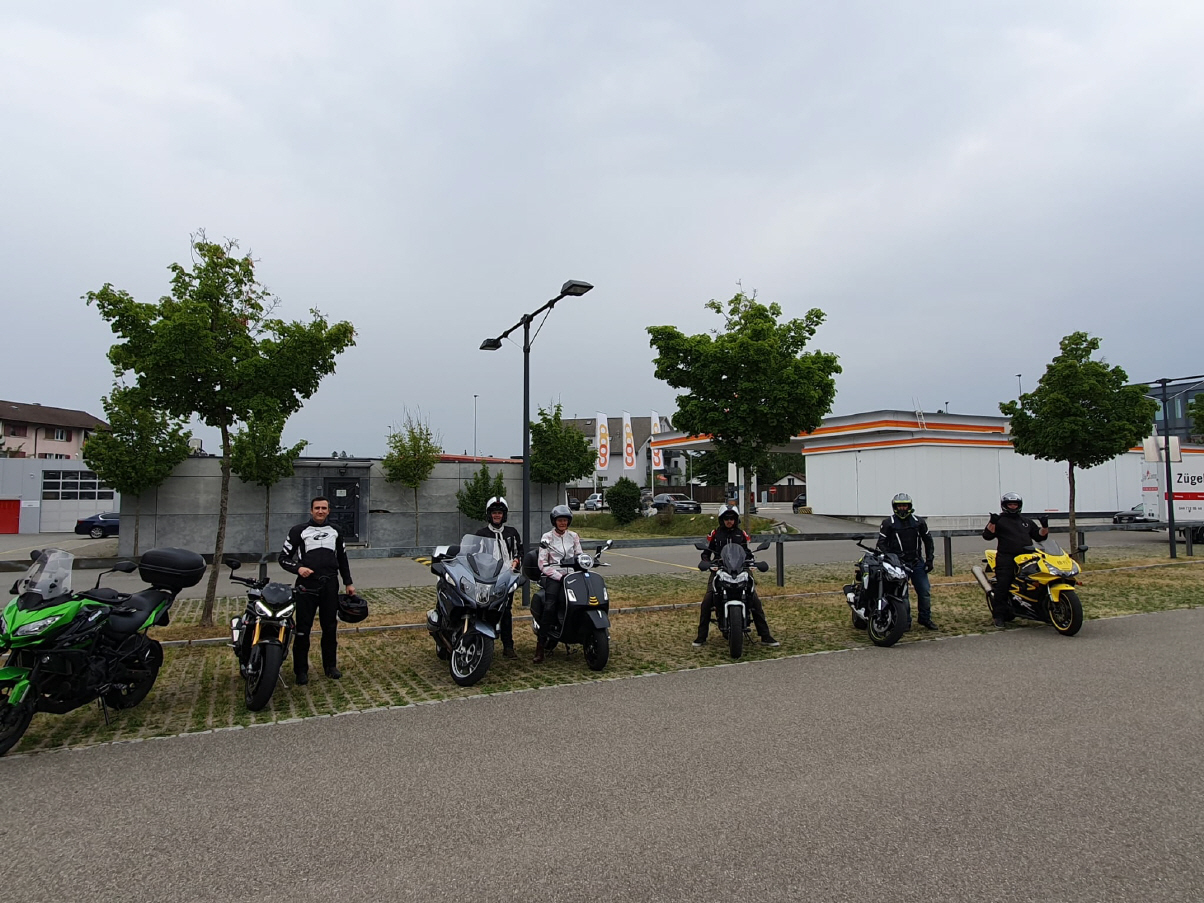 Seit dem April fahren die «Sunset-Riders» regelmässig am Donnerstag aus. Ab Dienstag wird jeweils in einem Chat eingeladen, Treffpunkt ist oft bei der COOP-Tankstelle in Brüttisellen oder, wie an diesem Donnerstag, bei der Passarelle in Uitikon-Waldegg. Es sah aus wie in alten Zeiten: Knapp ein Dutzend Motorräder standen bereit, darunter auch «Stürmi», der damals einer meiner Tourguides war.