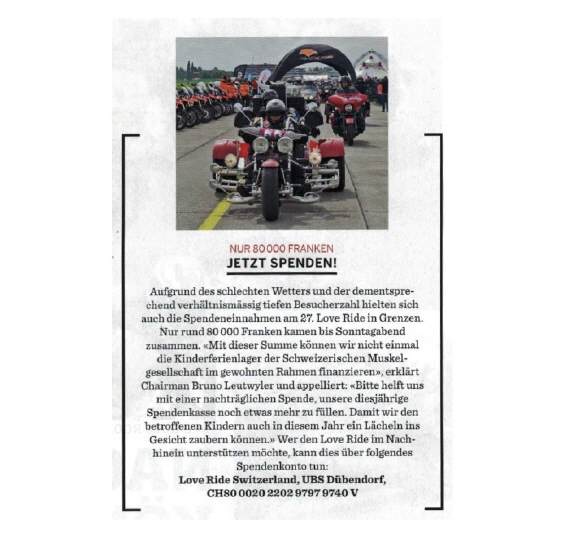 vom LOVERIDE Committee einen Aufruf, nachträglich zu spenden, damit das schlechte Teilnehmer-Resultat (nur etwa 1000 Töffs, 2200 Besucher) für die Empfänger keine Auswirkung hat: Eine unterstützenswerte Idee!
