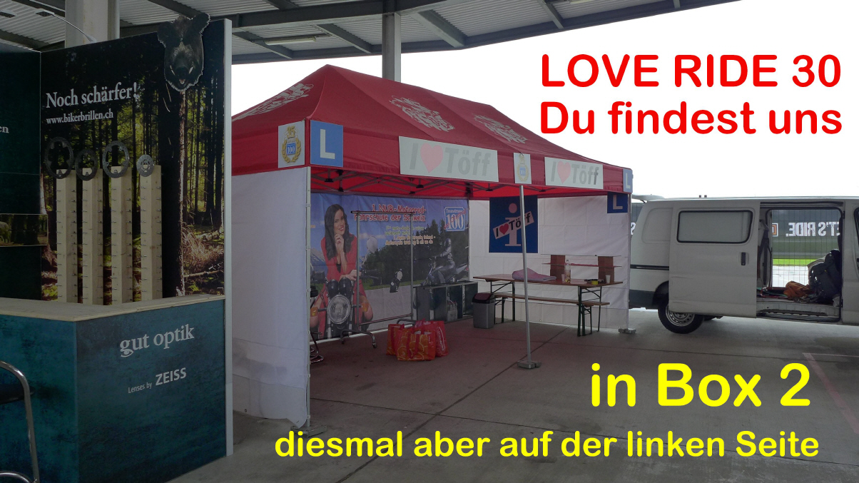 Der «25.LOVERIDE» stand unter schlechtem Wetter-Stern: Nun hoffen wir, dass es nach dem Regen am 20., dem Regen am 15.Loveride nun endlich, nach dem Überstehen der Pandemie, der Wettergott es gut mit uns meint. Mein Platz in der Box 2 wurde mir nun bestätigt, zwar nicht am genau gleichen Ort wie immer, aber immerhin wieder in Box 2. Mehr Details aufs Bild «klick»en! |