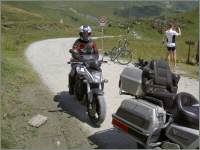 Zur Geschichte: In den Achtziger Jahren gab es Berichte im MotoSportSchweiz zu diesem einmaligen Treffen. Es war entstanden, indem Mario Artusio seinerzeit verschiedene BMW-Freunde eingeladen hat, sich auf dieser Militärstrasse zu treffen. Als Mitte der Siebziger Jahre die ersten Enduros im Stil einer Yamaha XT oder Honda XL auf den Markt kamen, nahm das seit 1967 in Bardonnecchia/Piemont alljährlich durchgeführte internationale Motorradtreffen immer grössere Ausmasse an. Das erste Mal fuhr ich 1987 mit meiner GoldWing Aspencade zusammen mit Bruno Mathys, der eine BMW R80RT hatte, zu diesem Treffen. Ich stellte mir meine Fahrt so vor, dass ich mit voll aufgedrehter Musikanlage zum Ziel vorfahren würde, zum Erstaunen aller übrigen Fahrer. Ich schaffte dann auch die Galerie, die sich in diesem Jahr in einem miserablen Zustand befand, bis zum Verkaufsstand zu fahren, wo es T-Shirt und Medaillen gab. Nach den vielen Spitzkehren, die ich bergab innen durch wegen des Gegenverkehrs teilweise am Lenkanschlag fahren musste, war es mir aber weder nach Musik (die hatte ich schon lange vergessen anzustellen!) noch nach Show zumute. Ich war einfach froh, überhaupt angekommen zu sein. |