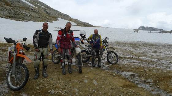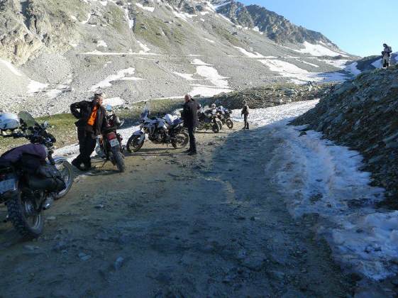 Mit 3 Enduro- (plus ich) und 5 StrassenfahrerInnen war die diesjährige Stella sehr erfolgreich. Wir bekamen Zuwachs aus dem Raum Basel (eh Baselbiet, sollte ich, der in Reigoldswil aufgewachsen bin, eigentlich wissen!) und mit Edy, der mit 70 Jahren der Älteste unter uns war, aus dem Kanton SZ. Am Freitag fuhren wir alle die «Testa dell'Asietta», das Herzstück unserer Tour, mit den Strassenmaschinen - ausser mir! Am Samstag dann leitete ich die Enduro-Gruppe, 2 davon befuhren den Sommeiller und berichteten, dass der Endpunkt gleich wie im letzten Jahr lag. Urs Frey übernahm die Führung in der Strassengruppe, auf den Pfaden vom Vorjahr - alle waren restlos begeistert! Wer an der Stella Alpina ein T-Shirt kaufen wollte, musste am Sonntag früh aufstehen. Bereits um 7 Uhr fuhren wir los, mussten dann aber auf das Auto mit den T-Shirts und Medaillen warten: Schliesslich berichtete ein Ankömmling, dass dieses weit unten geparkt hatte ... In der Zwischenzeit hatten wir viel Zeit für Fotos zu schiessen!!! Die Zurückgebliebenen mussten sich etwas gedulden, kamen wir etwa eine Stunde verspätet zurück (die KTM hatte wiederum gestreikt) und so starteten wir für die Rückreise erst nach 12 Uhr. Da wir aber keine grosse Mittagspause einlegten, blieben wir im Zeitplan und konnten die ganze Strecke geniessen, auch die Schotterpassagen. Der letzte Tag verlief auch ordentlich, da wir vom Col du Joly einen direkten Abstieg unter die Räder nahmen, was uns einen riesigen Umweg ersparte. So konnten wir kurz nach ein Uhr auf dem Forclaz-Pass das Mittagessen einnehmen und die Strecke übers Berner Oberland nehmen - mit Ausnahme von mir, der sich um einen neuen Hinterreifen für die PanEuropean kümmern musste ... |