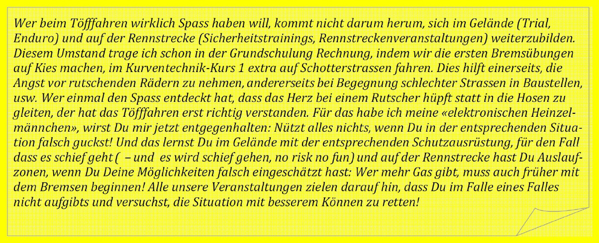 Bei Dany Wirz, «offroad-training.ch» haben wir zu fünft ein Training gebucht. Wer an der «Stella Alpina», der 5-tägigen Enduro-Tour mitmachen will und keine Geländeerfahrung mitbringt, sollte mindestens einen solchen 1-Tages-Kurs besuchen.