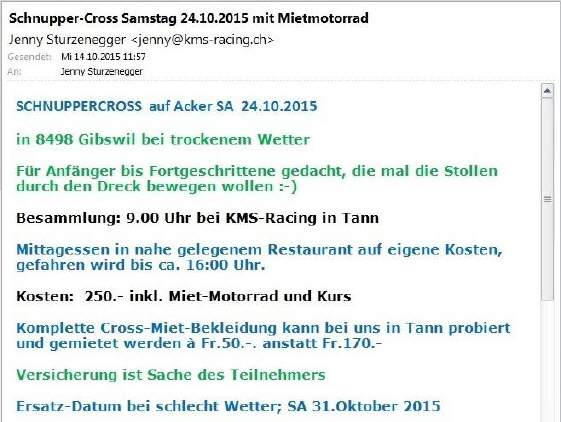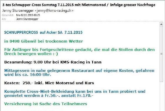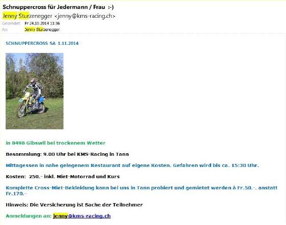 Termin nun DEFINITIV: Das erste «Schnuppercross» findet nun am Samstag, 10. Juli in Niederbipp statt - leider ohne mich! Wir sind unterwegs an unserer alljährlichen Stella-Reise [36 KB]