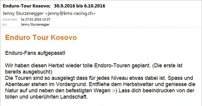 Sende mir ein Mail an urs.tobler (at) datacomm.ch mit Deiner Anmeldung, ob Einzelzimmer und Mietmotorrad. Der entsprechende Geländekurs von offroad-training.ch findet am 8.Juni auf der Piste von Niederbipp statt.