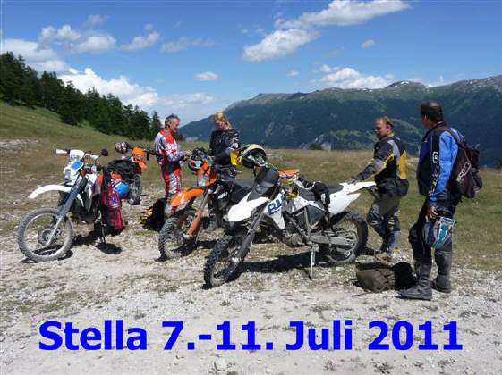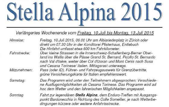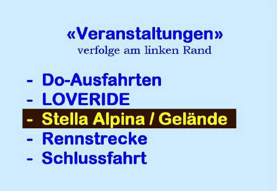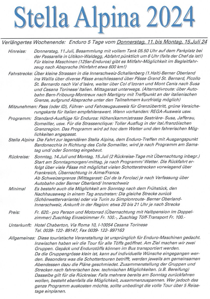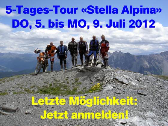 Die alternative Variante der «Stella» ist nun eine 5-tägige Töff-Tour anlässlich der Stella-Alpina vom DO, 7.Juli bis MO, 11.Juli: Diese Ausfahrt kann mit jeder Strassen-Enduro oder -Maschine gemacht werden, es besteht die Möglichkeit das Gepäck im Begleitfahrzeug transportieren zu lassen. Der HiAce-Bus dient sowohl als Gepäck-Fahrzeug wie auch als Notfall-Fahrzeug für gestrandete Fahrer(innen) oder Maschinen ... Die Kosten belaufen sich pro Person auf Fr. 550.-, Einzelzimmerzuschlag Fr. 100.- Theoretisch wäre eine Rückkehr auch bereits am Sonntag, 10.Juli möglich, wer diese Tour aber voll auskosten möchte, sollte unbedingt die 2tägige Rückreise mitmachen!
