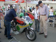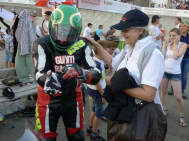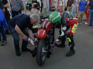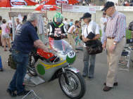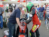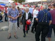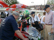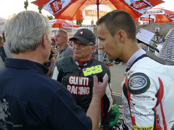 Der legendärste Rennfahrer der Schweiz, Luigi Taveri, mit 30 GP-Siegen und 3 TT-Gewinnen erfolgreichster Fahrer aller Zeiten, dann Bruno Kneubühler, der als erfolgreichster Privatfahrer überhaupt gilt, der 30 Jahre auf Weltniveau gefahren ist und mehrfach Vizemeister in verschiedenen Klassen wurde sowie der aktuelle Schweizer Haudegen Dominik Aegerter, der ein aktueller, sehr erfolgreicher internationaler Rennfahrer war in der Moto 2-Klasse - sie alle waren eingeladen, anlässlich der 100-Jahr-Feier dieser Institution, Ehrenrunden zu drehen. Die Bilder zeigen Bruno mit seinem ehemaligen Mech, Werni Kreis, wie er die Rennmaschine vorbereitet. Das Paar daneben, Otti und Nessi Dietiker, sind alte GoldWing-Freunde von mir und Otti ist wohl einer der grössten Honda-Fans auf der Welt, die es überhaupt gibt. |