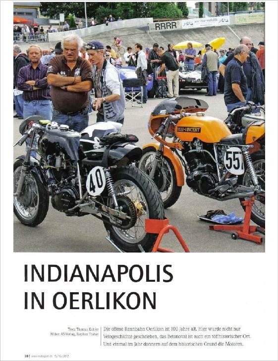 Das «Indianapolis von Oerlikon» wurde bereits zum zehnten Mal durchgeführt. Es war - wie immer - ein Riesen-Volksfest. Es gab Schauläufe verschiedener historischer Rennfahrzeuge, neben den Töff und Seitenwagen, auch viele Autos und Rennwagen aus alten Zeiten. Besonders beeindruckend waren amerikanische Rennwagen aus den 20er- und 30er-Jahren, die riesige Motoren und auch entsprechendes Gewicht auf die Räder brachten. Ich staunte nicht schlecht, wie diese Fahrzeuge durch die Steilwand preschten: Da wiegen sie ein Mehrfaches ihres Riesengewichtes, ob da die 100-jährige Betonkonstruktion nicht an ihre Grenzen stösst? |