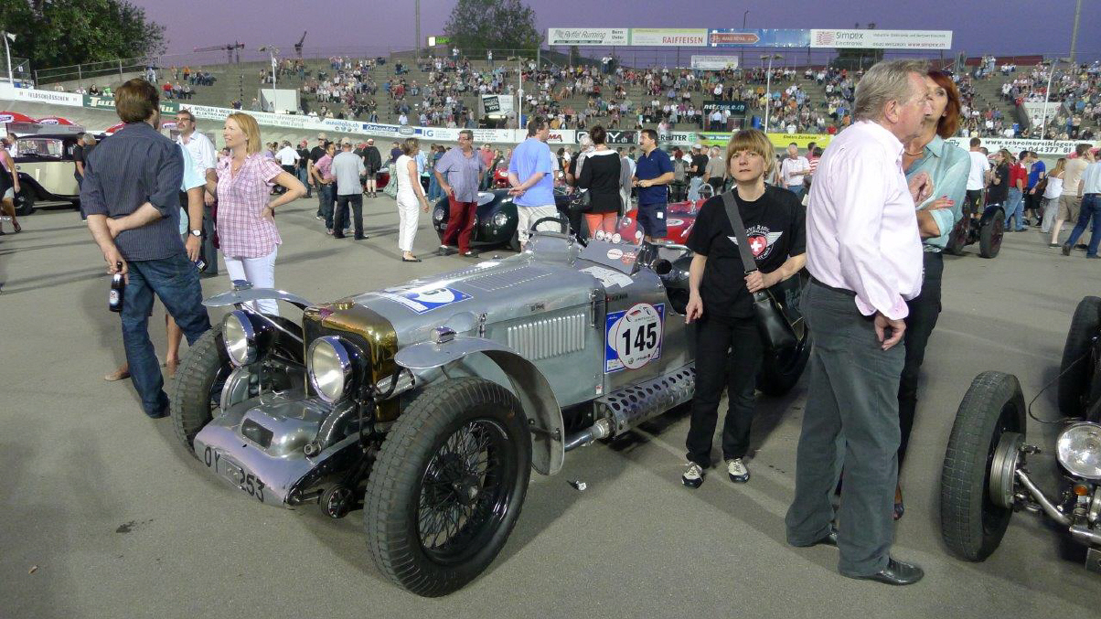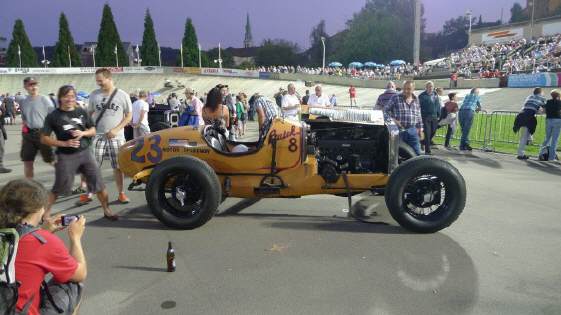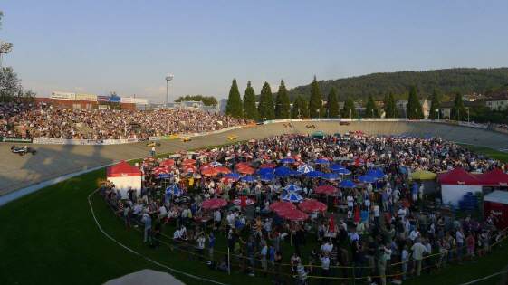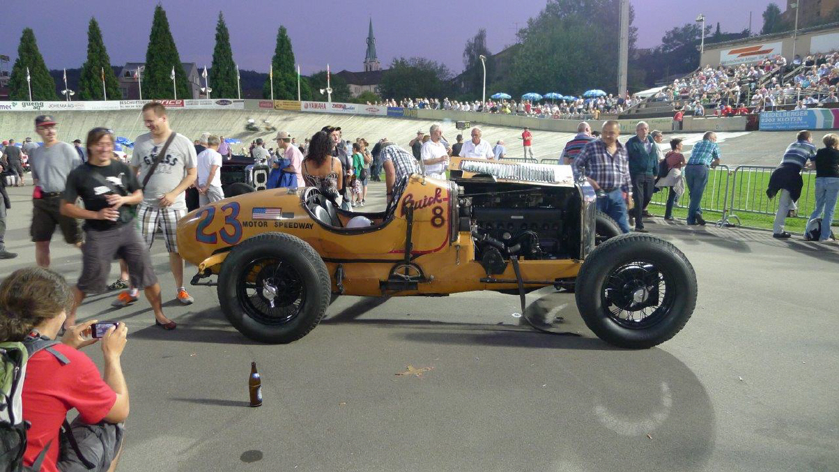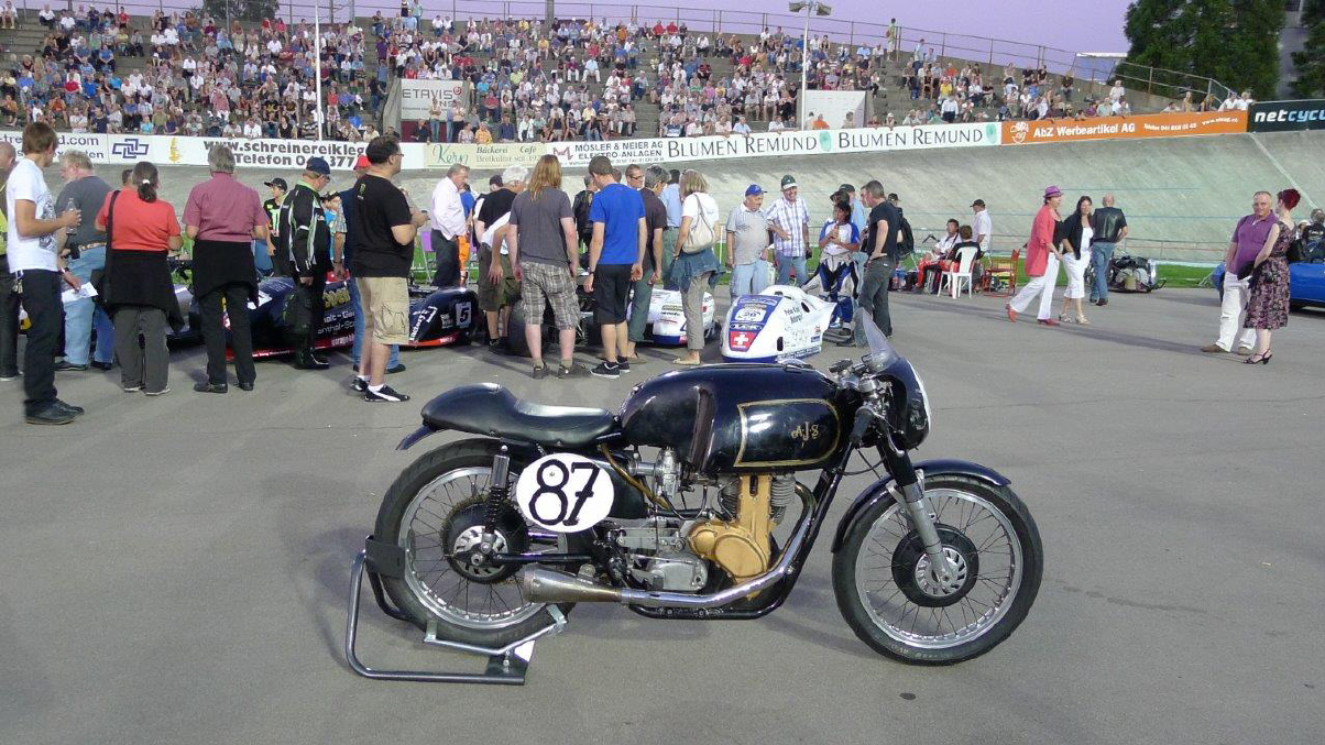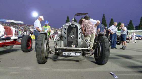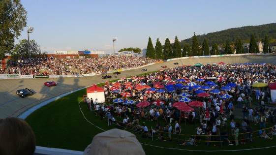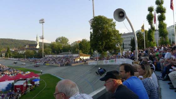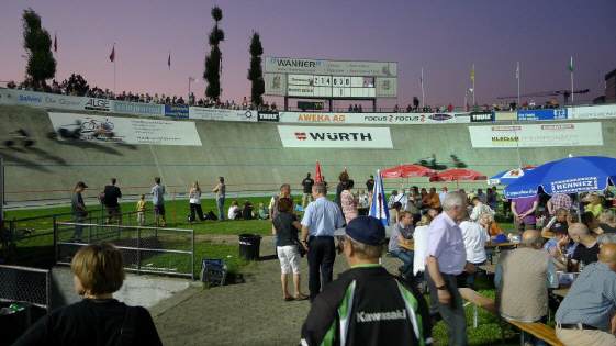 Der Abend war bei diesem Wetter fantastisch: Abwechslungsweise wurden verschiedene Rennen gezeigt, neben den Schauläufen der historischen Rennfahrzeuge. Die Steher-Rennen, mit den sonoren Töff-Motoren, die in ihrem Windschatten die Topspeed-Velofahrer mitziehen, die nicht «von der Rolle gheie» sollten ... Davon kommt dieser landläufige Spruch, wer weiss das schon in der heutigen modernen Zeit? Hier noch ein Bilder vom Abend, zu beachten die einbrechende Dunkelheit: Was für eine tolle Stimmung!