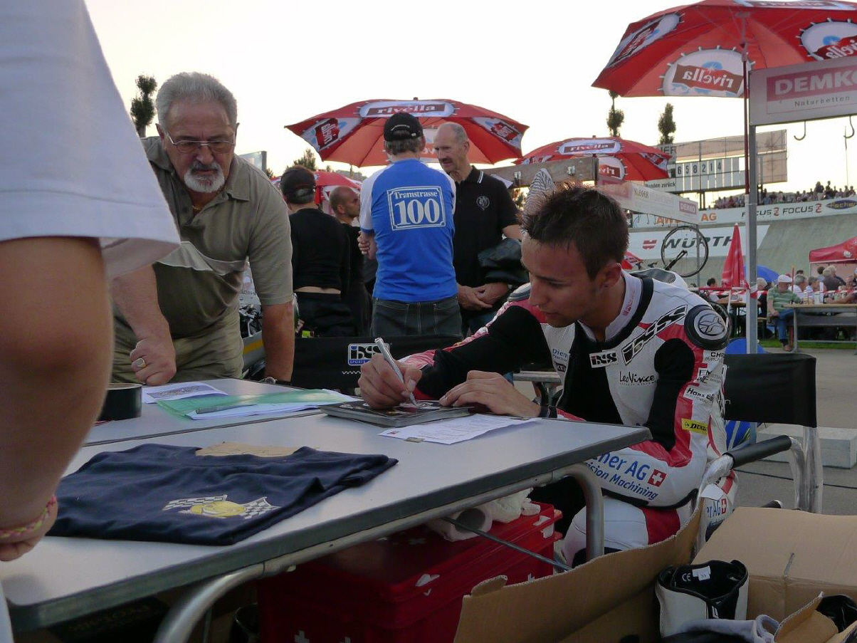 Dominik Aegerter am Autogramme abgeben, im Hintergrund bin ich mit Urban Jussel, von Müller & Jussel in Mönchaltorf, in das Gespräch vertieft.