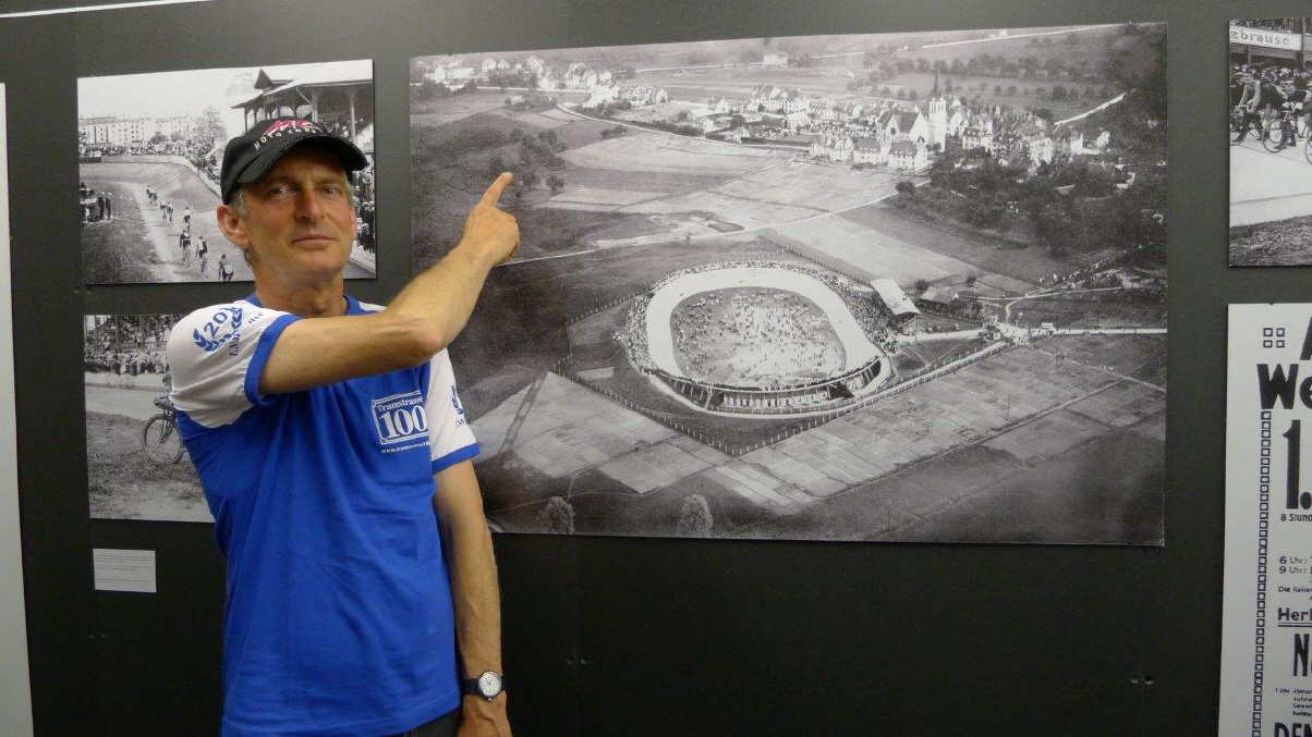 In einem Container wurde die Hundertjährige Geschichte gezeigt, 1912 wurde die Offene Rennbahn auf die grüne Wiese gebaut: Ich zeige den Platz, wo sich der Weg, die heutige Tramstrasse, nach dem Tram-Depot benannt, mit der späteren Apfelbaumstrasse kreuzt, wo später einmal die Bäckerei an der Tramstrasse 100 gebaut wurde.