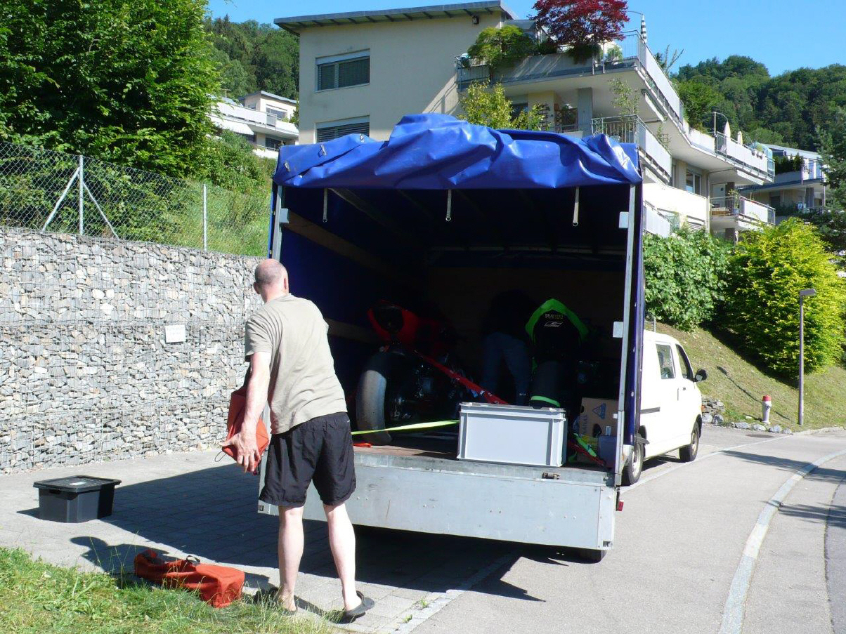 Der Samstag lag ganz im Zeichen des Ladens: Ich holte in Gibswil den riesigen gedeckten Anhänger ab, begann in Wila bei Claudio mit Material laden, dann in Ducati Zürich in Dietlikon dessen Maschine, die dort vorbereitet worden war, dann fuhren wir weiter zu Petr nach Zürich, wo auf dem Anhänger die zweite Maschine dazu kam. Auch Petr hatte einen Riesenhaufen an Material, das im Anhänger verstaut werden musste. Da die Motorräder nicht ganz leicht auf den hohen Anhänger gepackt werden konnten, entschlossen wir uns, für die Hinfahrt zwei Motorräder im Bus zu transportieren. So war es am letzten Ort für mich einfacher, Frank’s Töff zusammen mit meiner Maschine, die schon im Bus stand, festzubinden. Auch war es besser, wenn das Zugfahrzeug genügend Last auf die Achsen bringt. Petr, der nach der Veranstaltung weiter zu seinen Eltern reisen wollte, hatte ein Mietauto genommen und so fuhr am Sonntag Claudio mit ihm mit, während ich zusammen mit Frank am Sonntag um 9 Uhr die Reise antrat. |