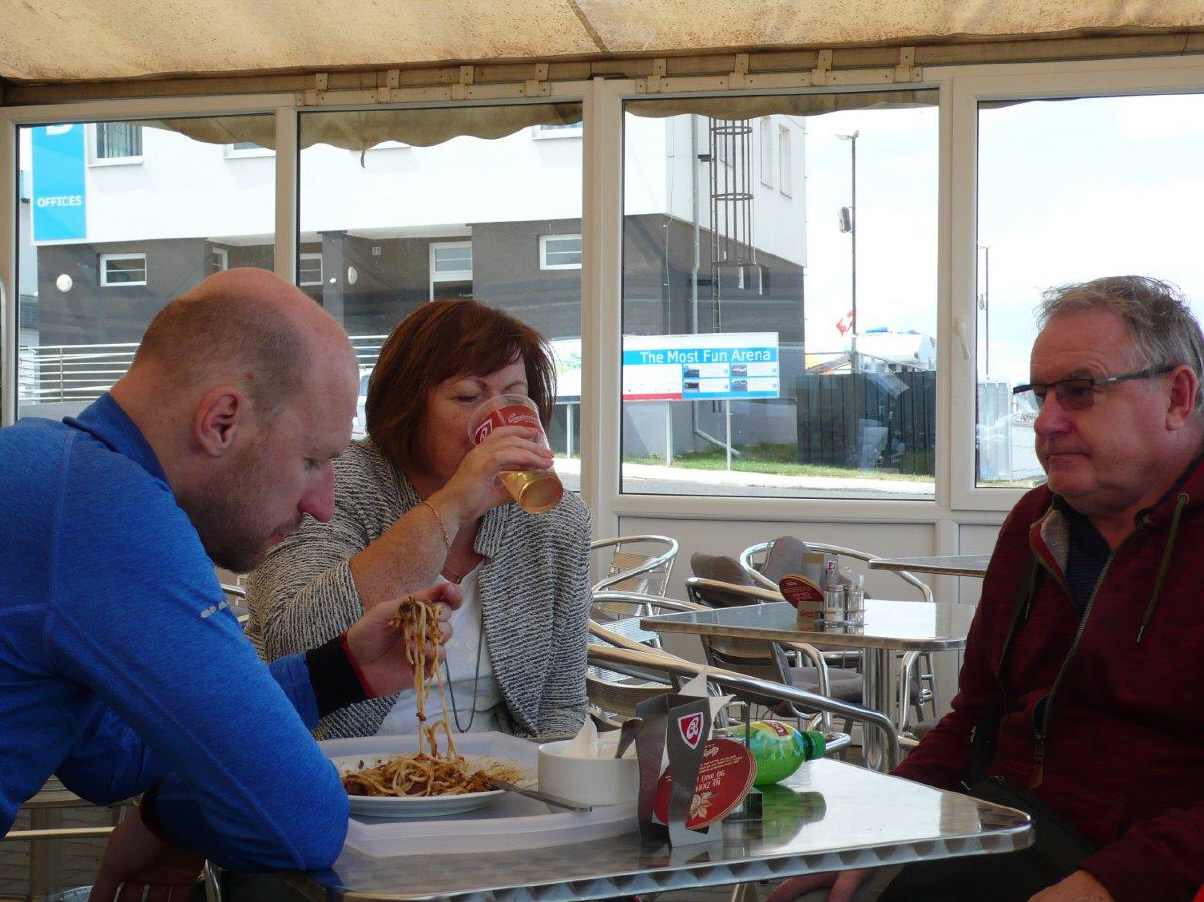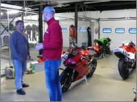 Die Motorräder bekamen zuvor rechtzeitig die Reifenwärmer, denn Slicks ohne Betriebstemperatur sind gefährlich, besonders wenn sie ganz neu sind wie in meinem Fall. Auch war die Nacht recht kühl gewesen und entsprechend tief war die Asphalttemperatur am frühen Morgen. Hansruedi Züger, der die ganze Veranstaltung mit seinem Instruktorenteam bestreitet, wünschte sich einen sturzfreien ersten Turn (erste Fahrsession in 4 Stärkeklassen), ich glaube, die ersten Stürze waren erst später zu verzeichnen. Frank startete in der grünen Klasse (Anfänger und Erstteilnehmer), Frank wurde in der gelben Gruppe aufgenommen, während Claudio und ich in der roten, also der zweitschnellsten Gruppe begannen. Der Morgen bestand aus drei Einsätzen je Gruppe. Während des Vormittags trafen Petr’s Eltern ein, die in Prag wohnen und extra einen Ausflug planten. Sie blieben dann auch zum Mittagessen im Restaurace (dieser Name hat nichts mit dem Race-Track zu tun) in der Anlage: Das Essen hier ist gut und günstig, wenigstens dank unserem Wechselkurs.