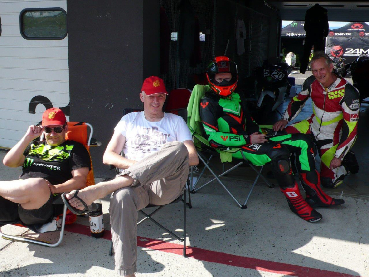 Unser Weg führte uns über Vorarlberg auf die Strecke München-Regensburg, wo wir nach weiteren 150 Kilometern über die Grenze nach Tschechien abbogen. Nach weiteren 100 Kilometern waren wir am Ziel, dem Autodrom von Most in Nordtschechien, nahe der deutschen Grenze. Petr und Claudio waren etwa eine Stunde früher da und hatten bereits die Hotelzimmer bezogen. So machten wir uns an der Box 20 ans Abladen. Die Platzverhältnisse zu viert sind gut, da nur die beiden Hobby-Rennfahrer mit Material anreisten, bei Frank und mir belief es sich praktisch nur auf Ersatzreifen.