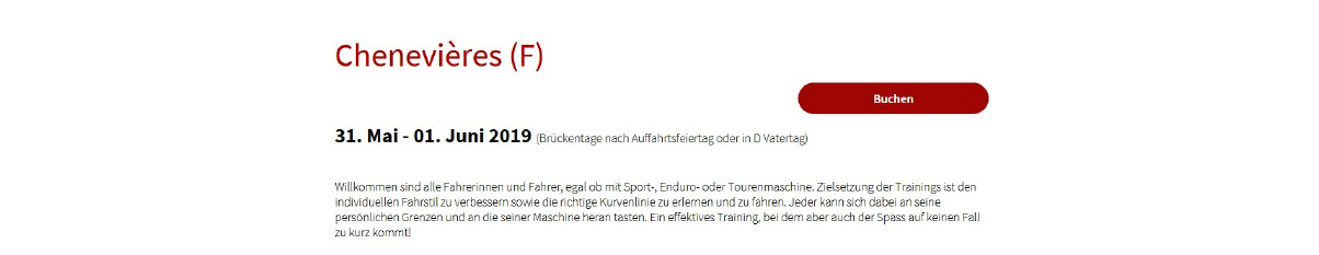 Möglichkeit für 2-tägigen Ausflug anlässlich der Rennstrecken-Veranstaltung von Jacques Da ich zuhause in der Garage ein unbenützte CBR 600 für die Rennstrecke herumstehen habe, suche ich von Zeit zu Zeit, diese artgerecht zu bewegen. Hiefür ist mir das von Jacques Cornu ausgeschriebene Training auf der herrlichen Strecke von Chenevières/F in die Augen gestochen und ich habe mich mit ihm am 1.August anlässlich unseres Ausfluges im Hafen von Neuenburg getroffen. Er ist einverstanden, meiner Gruppe Gastrecht zu bieten. |