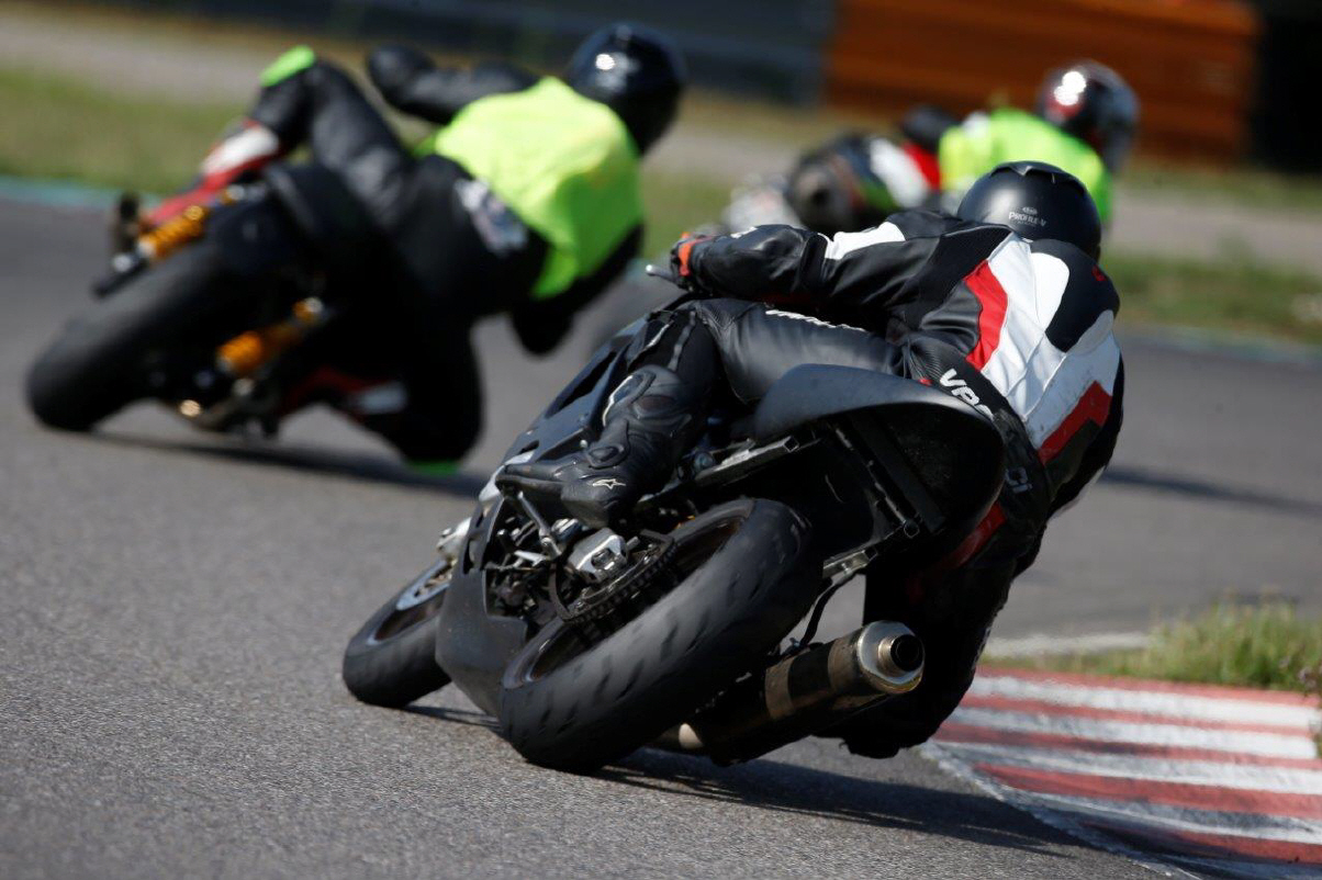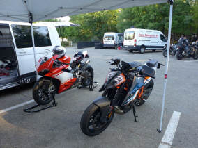 Neben mir hatten sich zwei Innerschweizer installiert: Sie waren mit Peter Studer «have-fun» Fahrtrainings schon mehrmals unterwegs gewesen. Horst hatte ein ganz besonderes Motorrad, eine V2-1299 Panigale «Superleggera», von der es nur 500 Stück davon gibt. Die Daten sind umwerfend: 156 Kilo Fahrgewicht stehen 215 PS entgegen, so gab Horst auch unumwunden zu, dass das Motorrad in jedem Fall besser wäre als sein Fahrer ... Da er aber ausserhalb des Alters von gefährdeten Fahrern liegt, auch viele Erfahrungen auf der Rennstrecke mit Autos mitbringt, denke ich, ist die Maschine in seinen Händen gut aufgehoben. Urs, seine Kollege fährt eine KTM Super Duke 1290. Die beiden fuhren in der Gruppe gelb. Ich, in der Gruppe rot, erlebte in erster Linie die Testfahrer, die z.T. in einem unheimlichen Tempo unterwegs waren.