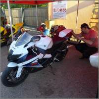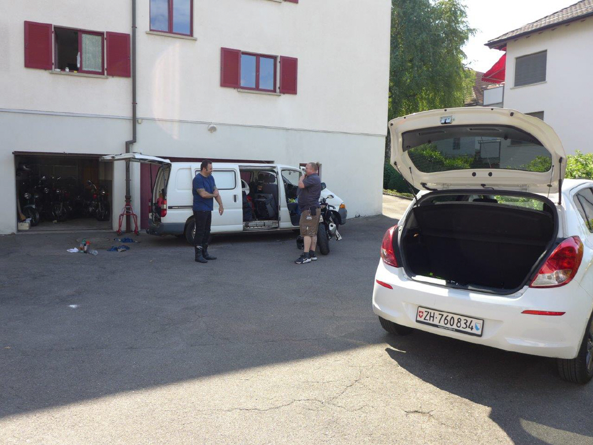Die Vorfreude war gross, als wir das Rennstreckentraining in Angriff nahmen: Wer, was, wie und wo - schliesslich musste die ganze Infrastruktur bereit gestellt werden, das Gepäck geladen und schliesslich mit den Fahrzeugen hingefahren werden. Schon ein wenig Routine hatten wir beim Einladen des Buses: Diesmal kam Yannis allein helfen, da er sich den Tag frei genommen hatte. |