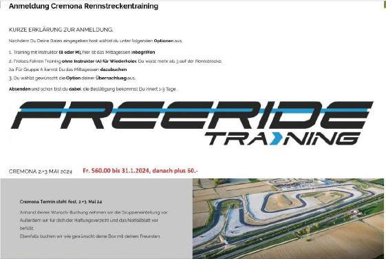 Da leider die Veranstaltung an Auffahrt in Chenevières wegfällt (ich liebe diese Rennstrecke!), startet die Saison bei tz-motorsport mit einem zwei-tägigen Event erst Ende Mai. Dort haben wir uns (momentan zu fünft, Stand: 3.1.2024) für Ende Mai angemeldet. Bei www.freeride-training.com, ebenfalls Berufskollegen von mir, wurde ich fündig. Da ich Cremona anfangs Mai als Wetter-bedingt gut beurteile, habe ich mich nun definitiv angemeldet. Wer sich noch kurz entschliesst dafür (1-2 Personen) kann sich bei Koni & Sepp melden, nicht vergessen meinen Namen zu nennen. Es pressiert!