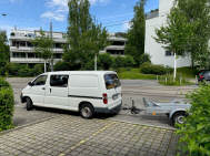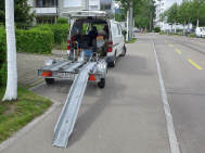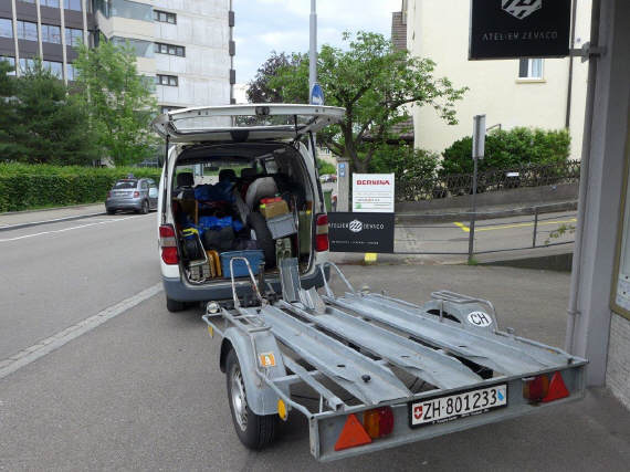 Nach meinem Arbeitseinsatz mit dem Schulbus vom Freitag musste ich erst den Anhänger abholen, den mir in verdankenswerter Weise Colin, vom Atelier Zevaco an der Gubelstrasse in Oerlikon, zur Verfügung stellte. Ich traf vor 16 Uhr bei Yannis in Dietikon ein, wo wir sein Gepäck und seinen Töff luden. Dani, der noch bis 16.30 Uhr arbeiten musste, stiess dann in Neuenhof zu uns, wo wir auf dem Parkplatz des IBIS Hotels einen Platz fanden. Claudio fuhr mit Karin in einem separaten Bus, um einiges früher als wir. |