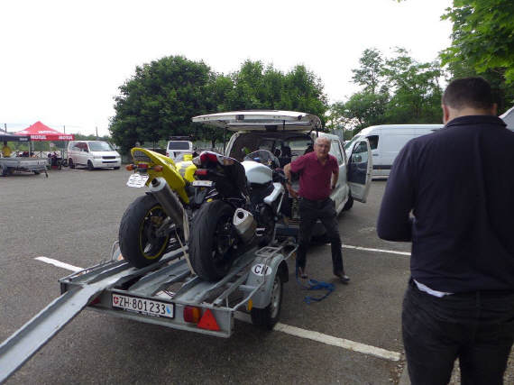 Da wir am Wochenende nicht allzu viel zum Fahren gekommen waren, nützten wir diesmal die volle Länge aus: Auch mussten wir nicht nach Hause fahren. Als die Gruppe grün ihren letzten Turn absolviert hatte, begann ich das Auto auszuräumen, um meinen Töff als erstes einzuladen. Schon vorher hatten wir den Sprit, der wegen des Wetters «unabgebrandt» verblieben war, in den Töffs und im Auto eingefüllt. Auch kümmerte ich mich um die Fotos: Reinhold Trescher, der hervorragende Bilder schiesst, hatte sich mit seiner Frau Ulli bei der Einschreibung eingerichtet. Wegen des schlechten Wetters konnten sie viele Gespräche mit den Kunden führen. Reinhold ist nicht mehr der Jüngste (… wie ich auch …), er wohnt recht nahe zum Circuit auf der anderen Seite der Grenze und ist der Hoffotograf zumindest aller Schweizer Veranstalter. Er hatte sich die Mühe gemacht, auch am Sonntag noch bis zum letzten Turn am Pistenrand zu lauern, so kamen doch noch einige Bilder zusammen. Den regelmässigen Kunden gaben sie wegen des schlechten Wetters zum Preis einer Eintagesveranstaltung alle Bilder der beiden Tage. Auch bedanke ich mich bei den Treschers, dass sie mir erlauben, die Fotos auf meiner Webseite zu verwenden.