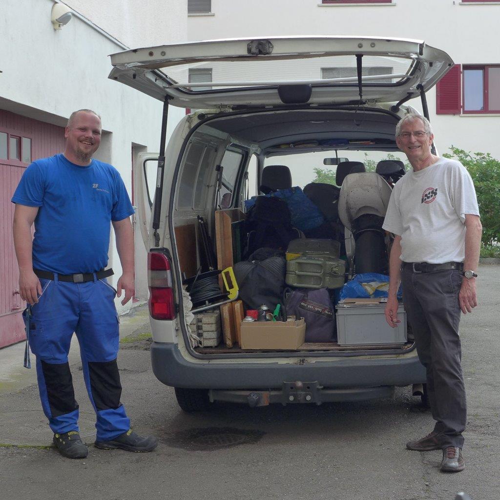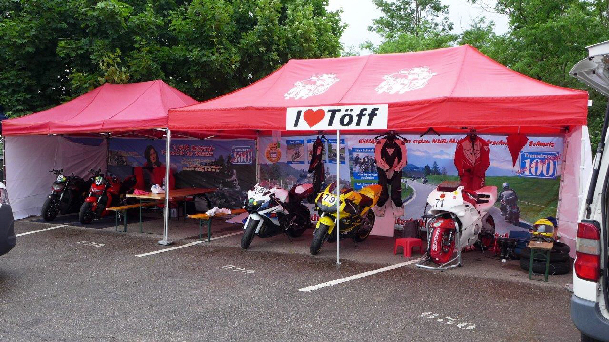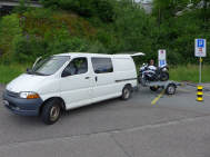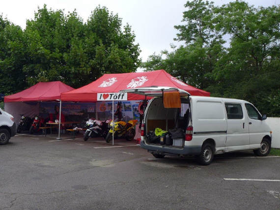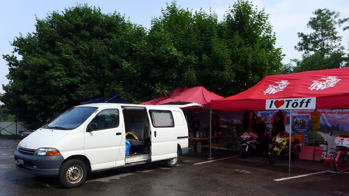 Er startete am DO-Abend mit Auto packen an der Magdalenenstrasse: Neben meinem Töff gehörten die beiden Zelte (eines ausgelehnt bei Michi von Meier Motos – besten Dank!), dann die Tischgarnitur mit Bänken, diverse Benzinkanister und zusätzliche Ausrüstung wie Regenräder, Aufbock-Hilfen, Reifenwärmer, Werkzeug, usw. usf. in den Toyota HiAce-Bus. Dani brachte auch gleich seine Ausrüstung mit, da er am Freitag direkt mit dem Töff zu uns stiess. |