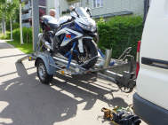 Inzwischen sind wir ein ziemlich eingespieltes Team. Diesmal hatten wir das Glück, dass wir die Zelte im Trockenen einpacken durften. Das macht die Sache wesentlich einfacher. Michi’s Zelt, welches Claudio und Karin gedient hatte, wird mitsamt dem Dach «eingetütet». Von mir kamen die Gewichte und die Wände, die uns diesmal wegen der heftigen Winde vor besondere Probleme gestellt hatte. Eines ums andere, ohne Hektik, wurde im Bus verstaut: Als der Platz inzwischen vollständig leer war, mussten wir noch die Töffs auf den Anhänger laden.