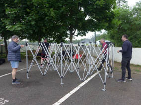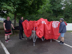 Die Fahrt führte beim Grenzübergang Rheinfelden in einen kleinen Stau, danach konnten wir aber dank Yannis iPhone mit dem GPS staulos, erst zur Schlüsselübergabe des Hauses, dann zur uns bekannten Rennstrecke fahren. Claudio und Karin warteten schon lange, sie waren froh, dass wir endlich eintrafen: Der Himmel verhiess nichts Gutes, aber schliesslich konnten wir trotz vereinzelten Tropfen mehr oder weniger trocken aufbauen und einrichten. |