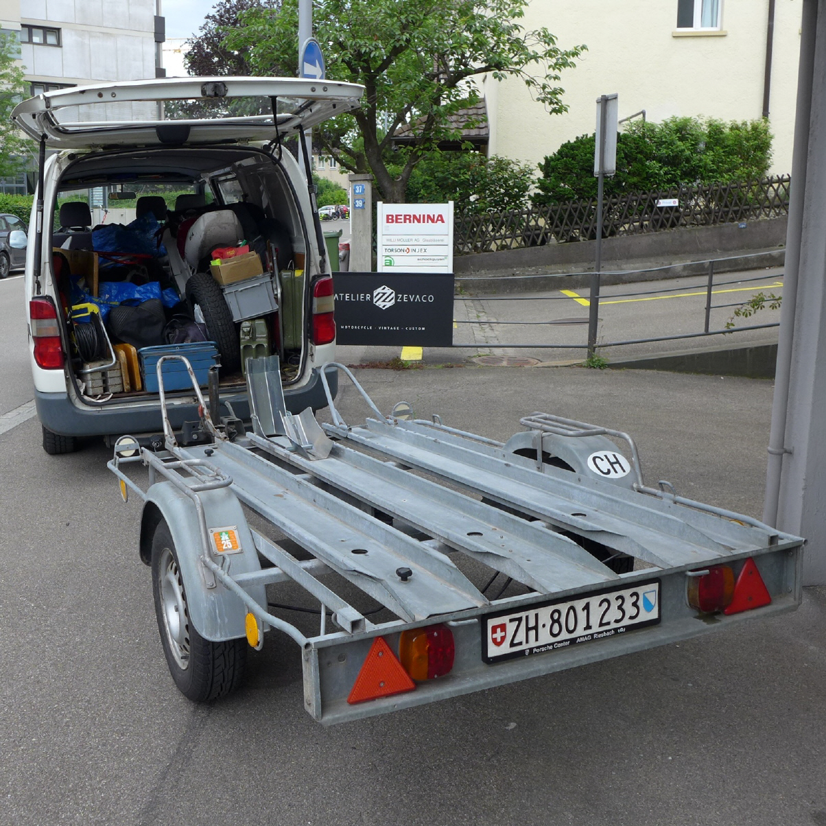 Als wir kurz vor 5 Uhr in Neuenhof eintrafen und Dani erwarteten – für beide, etwa um halb 5 gestartet, waren es 20, 25 Minuten bis zum Treffpunkt – wir warteten, und warteten und warteten. Verschiedene Töffs fuhren vorbei und es wurde Viertel nach fünf bis er tatsächlich eintraf. Wir banden den Töff fest und Dani übernahm den Chauffeurposten, während ich mich mit Yannis in die Beifahrer-Sitzbank teilten. |
