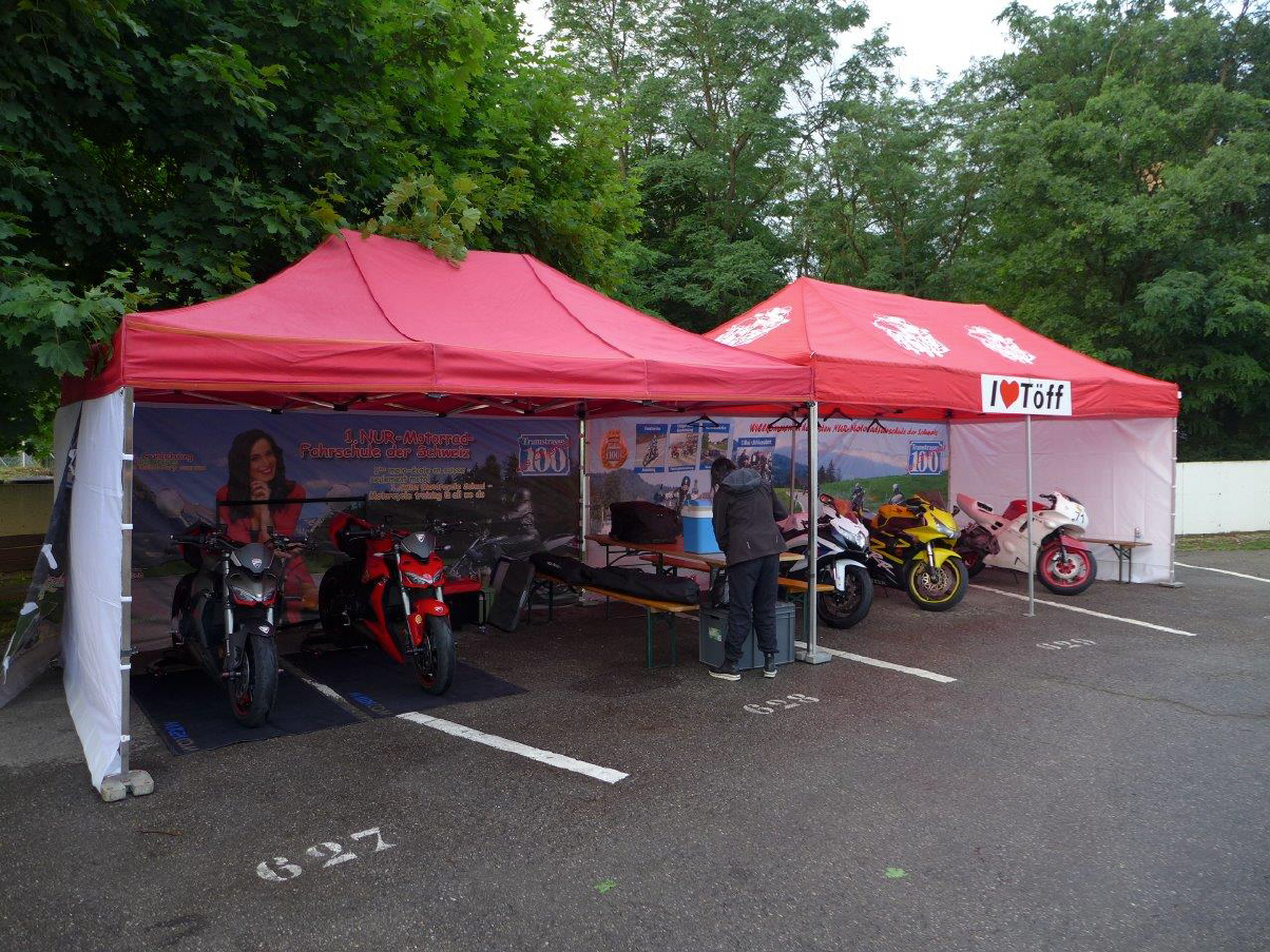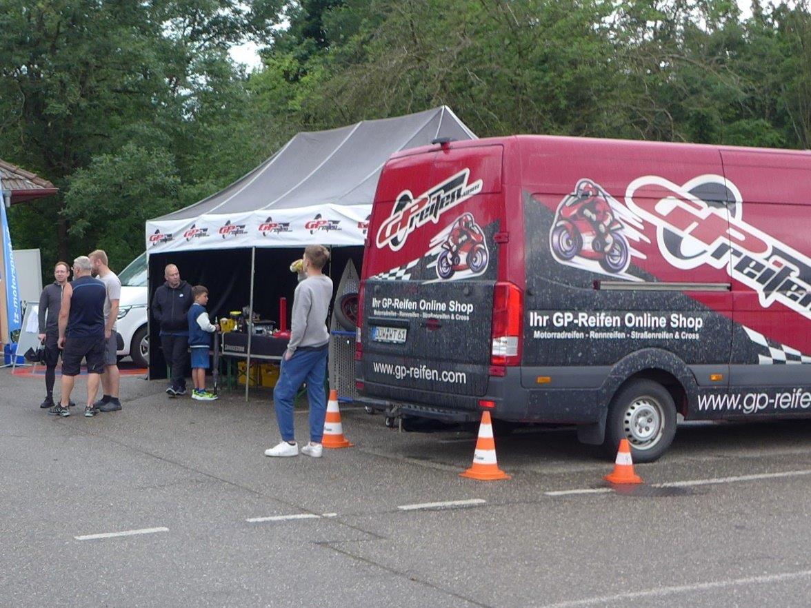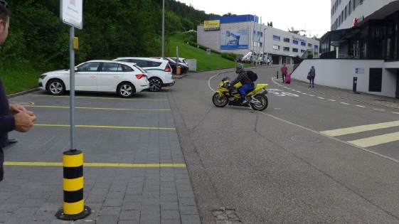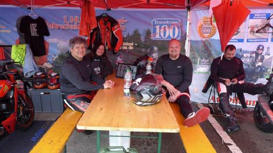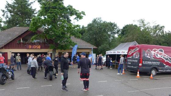 Auf dem Weg zur Rennstrecke hielten wir noch bei einer Bäckerei-Konditorei. Gegen halb 8 Uhr waren wir bereits auf dem Platz. Am ersten Tag muss alles an seinen Platz: Rennkombi, Helm und Handschuhe – auch die Unterwäsche gehört dazu. Mein Töff war noch nie gelaufen und, wie erstaunlich, schon nach kurzem «Örgele» sprang der Motor an und ich konnte ihn in der technischen Kontrolle zeigen: Das macht schon Sinn, denn die Bremsbeläge waren am Ende des Lebenszyklus und ich wurde darauf aufmerksam gemacht. Zum Glück hatte ich neben Ersatzreifen auch Ersatzbremsbeläge im Gepäck. Gegen Viertel nach 8 findet jeweils die obligatorische Fahrerbesprechung statt. |